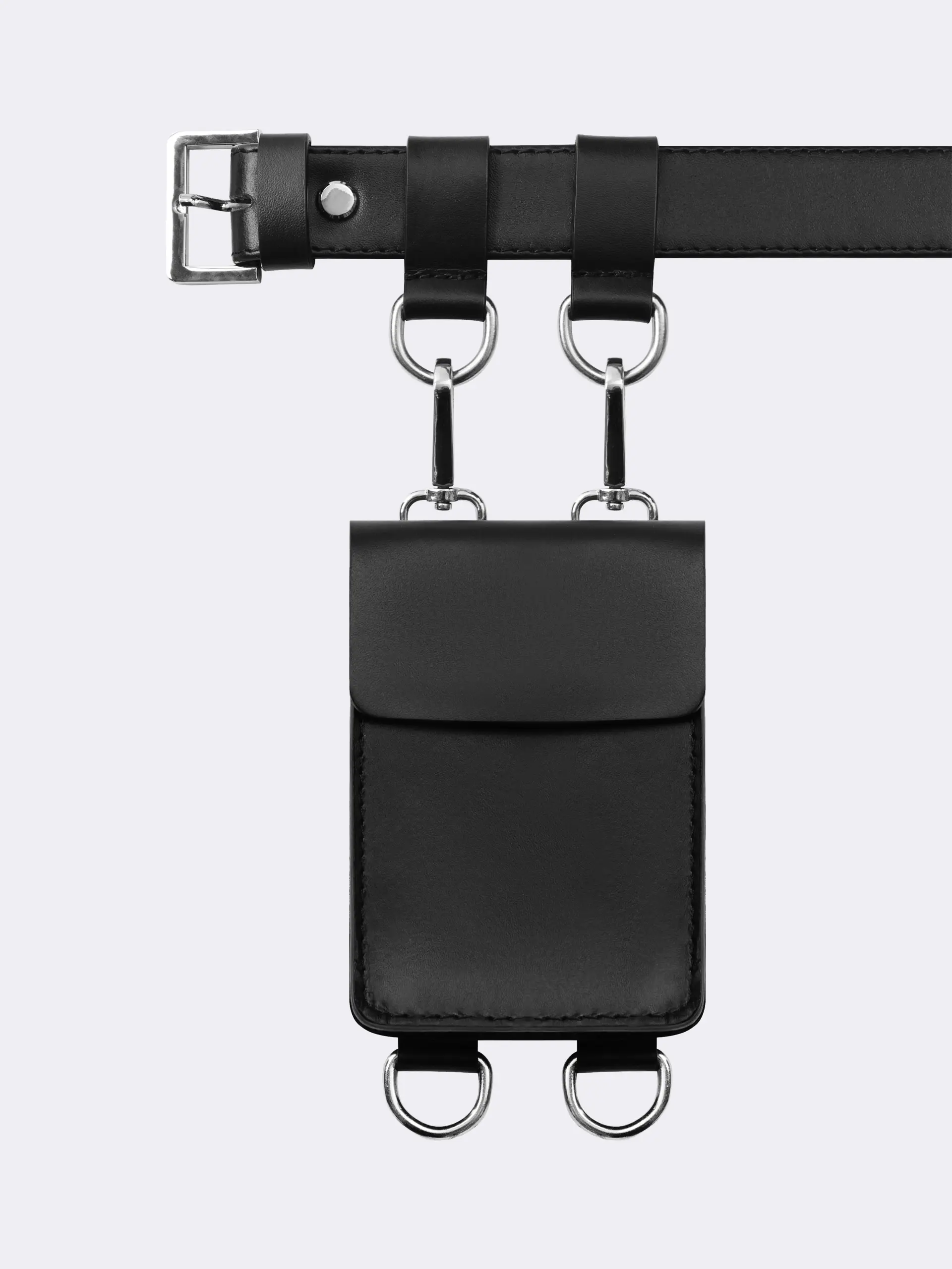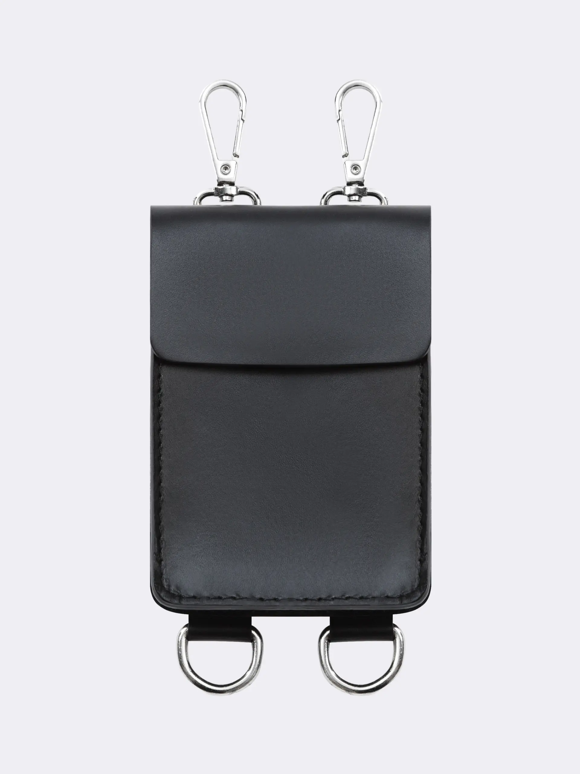 Сумочка с застежкой черная из натуральной кожи. Оснащена двумя карабинами, за которые ее можно прикрепить к баске или ремню.