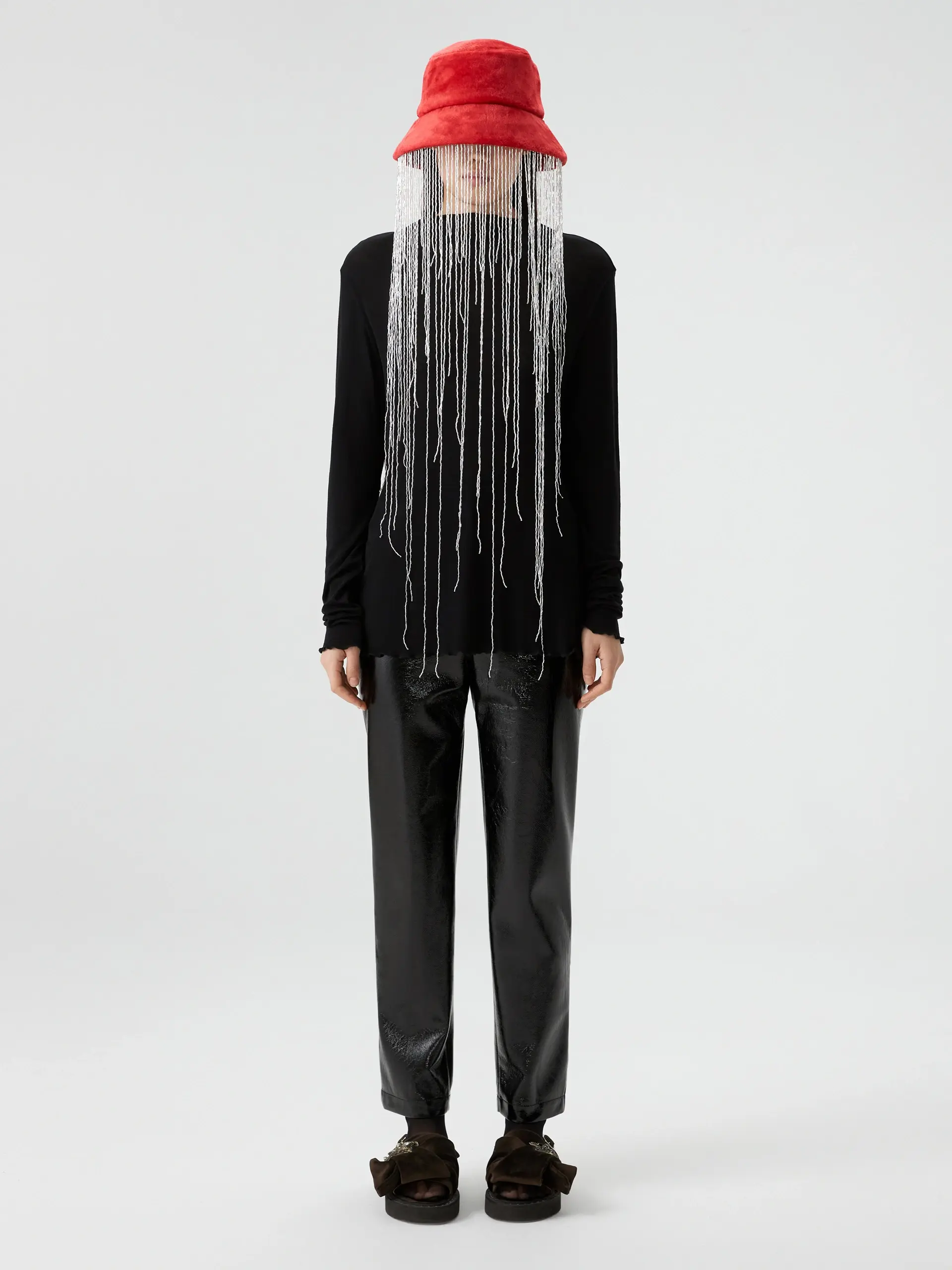 Подиумная панама унисекс из ворсовой мягкой ткани. По окружности полей отделка бахромой из стекляруса длины миди. Поля панамы укреплены плотной вставкой, которая хорошо держит форму. Подкладка из атласной ткани.