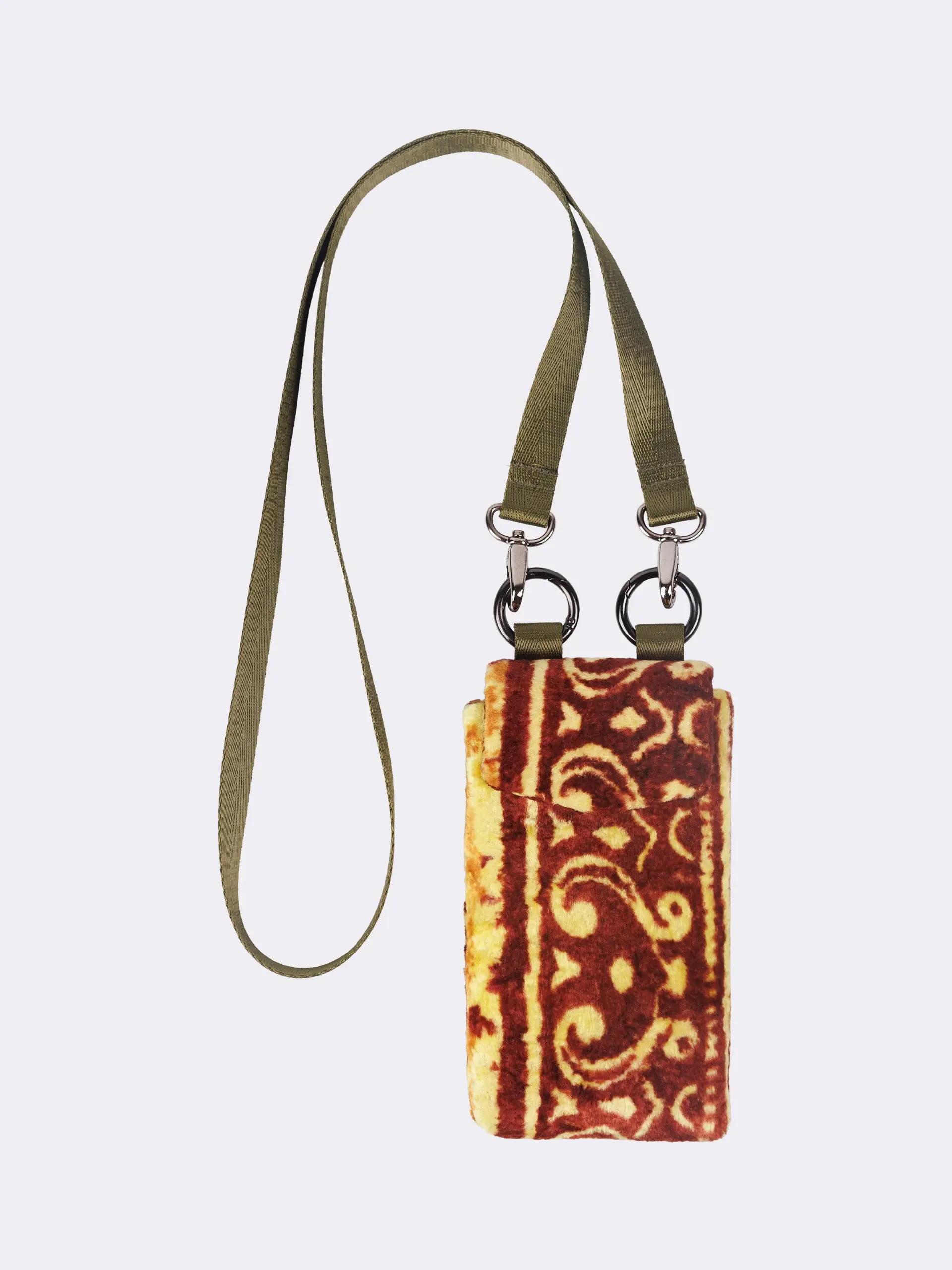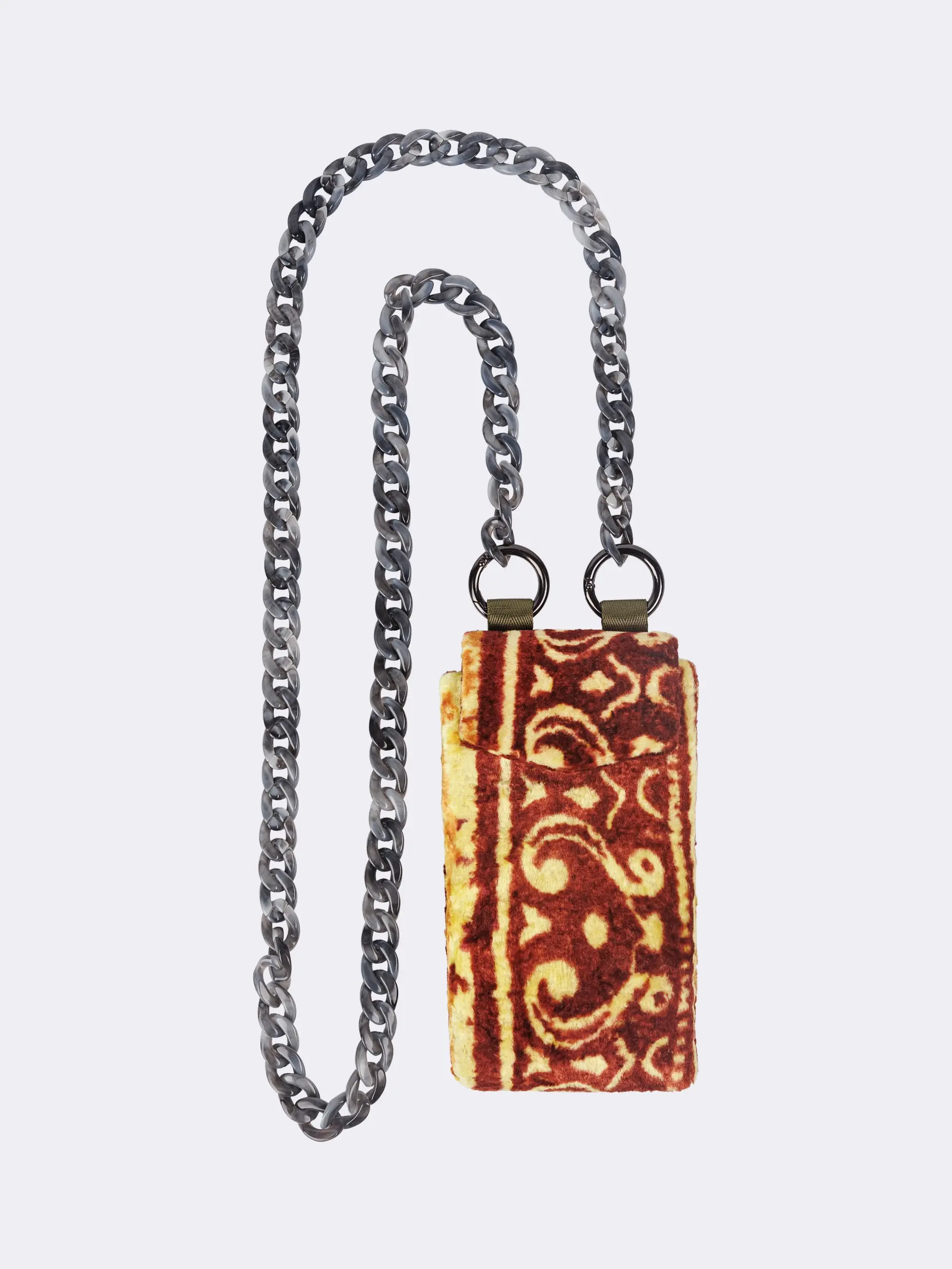 Чехол для телефона из ковра. Откидной клапан с застёжкой на магнитную кнопку. Съёмная пластиковая длинная ручка в виде цепи.