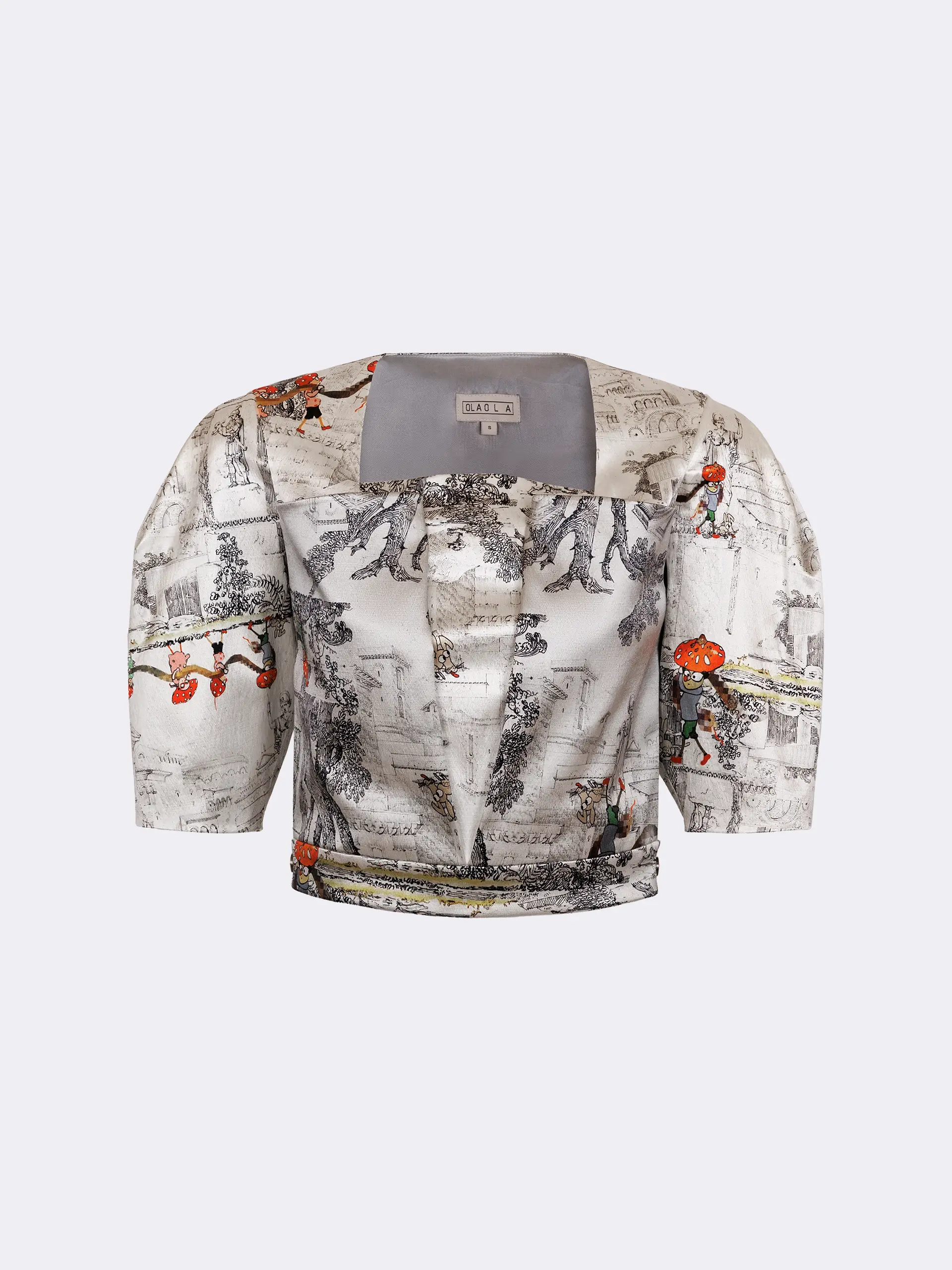 Топ на запах из струящейся ткани. Завязывается на ленты вокруг талии. Цельнокроенные короткие рукава. Многослойный лацкан со вставкой из атласной ткани на V-образном декольте.