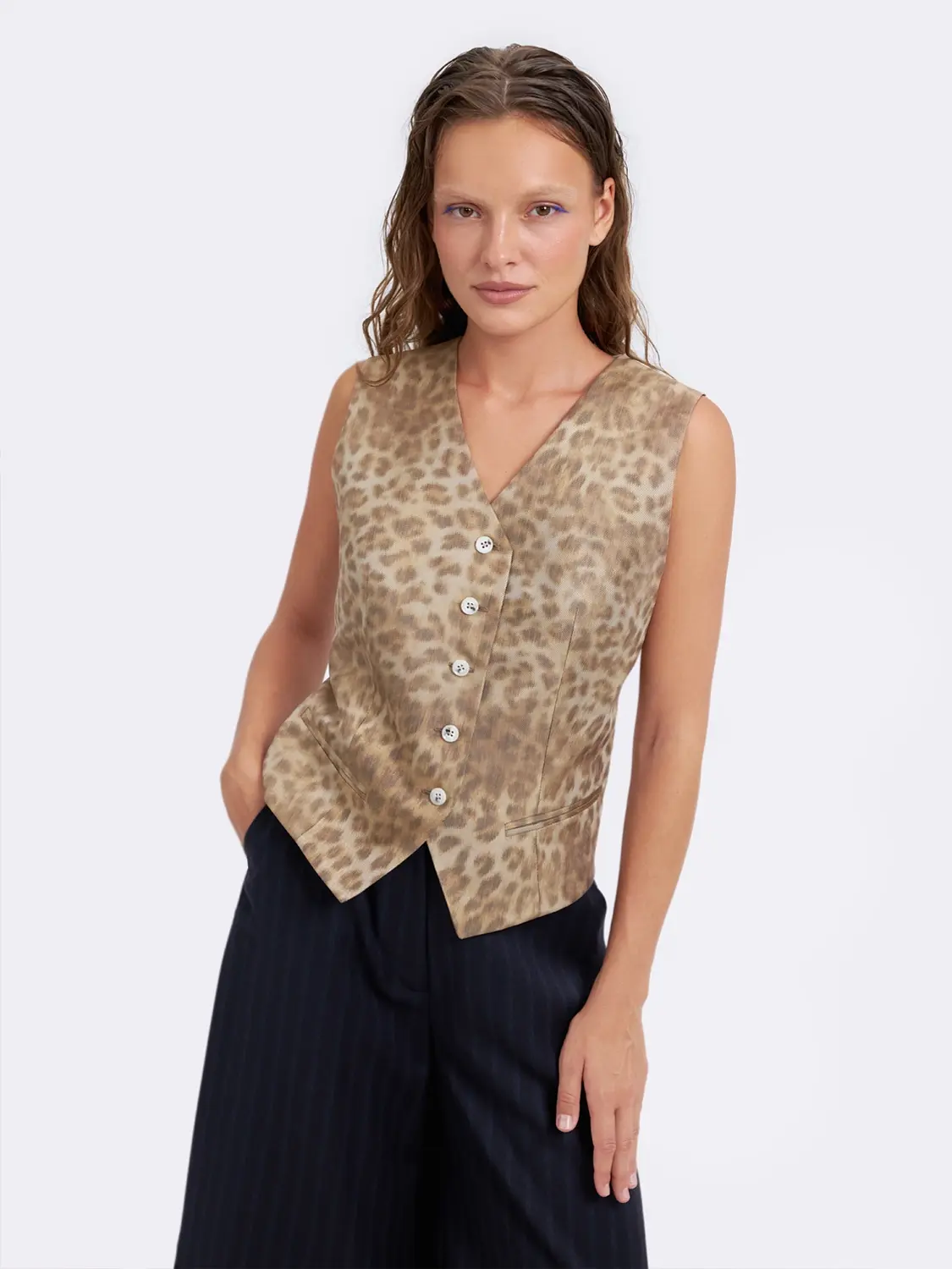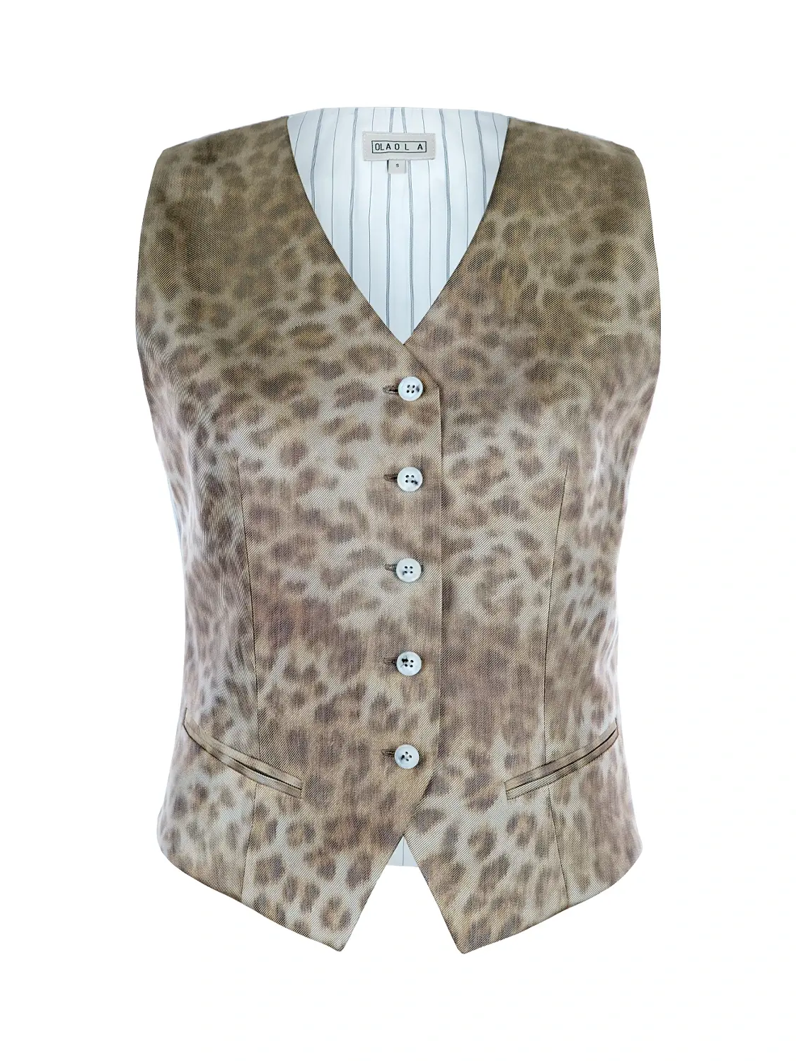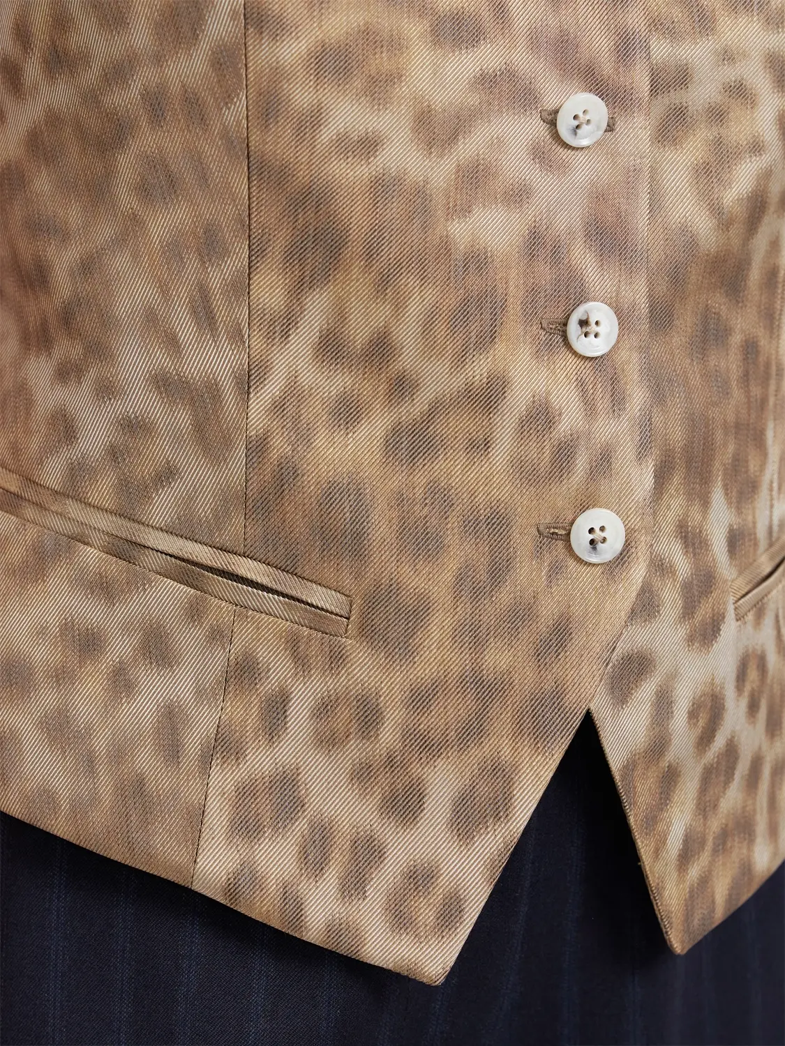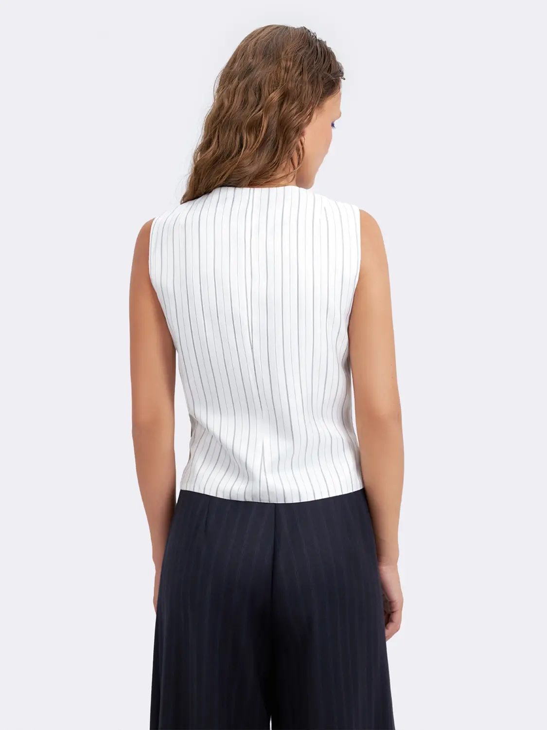 Приталенный жилет из полупрозрачной клетчатой ткани с отрезной линией талии и ярусной баской с контрастными вставками по бокам. Однобортная застежка на пуговицы. Английский воротник.