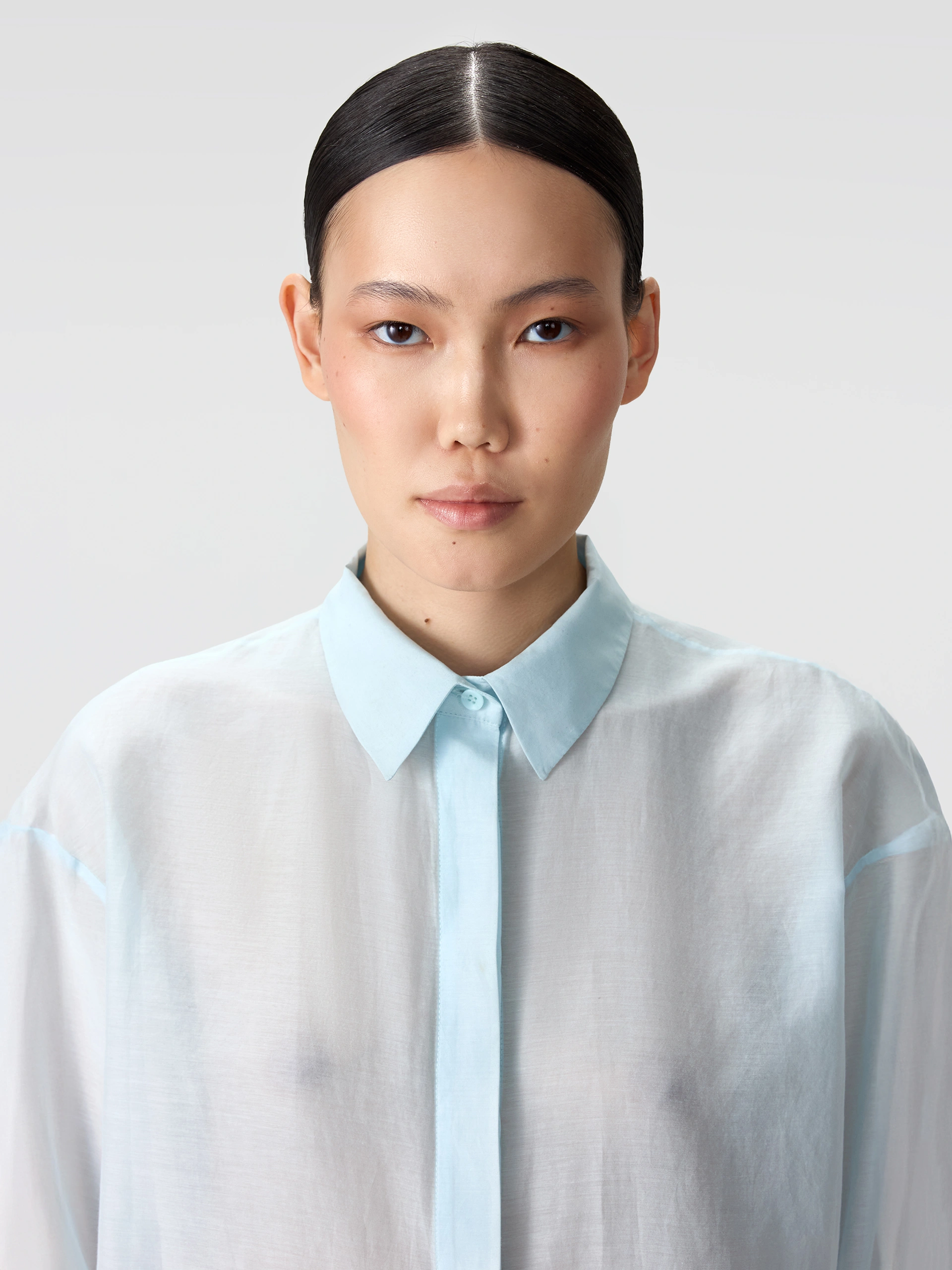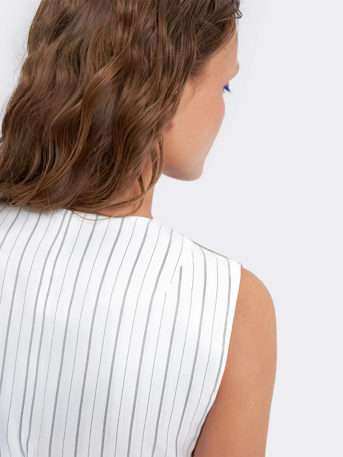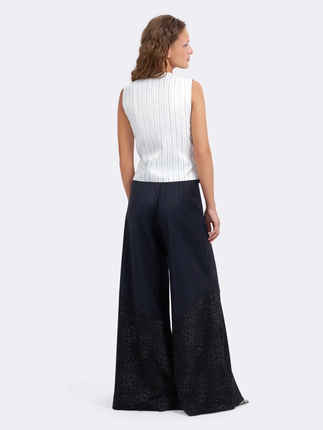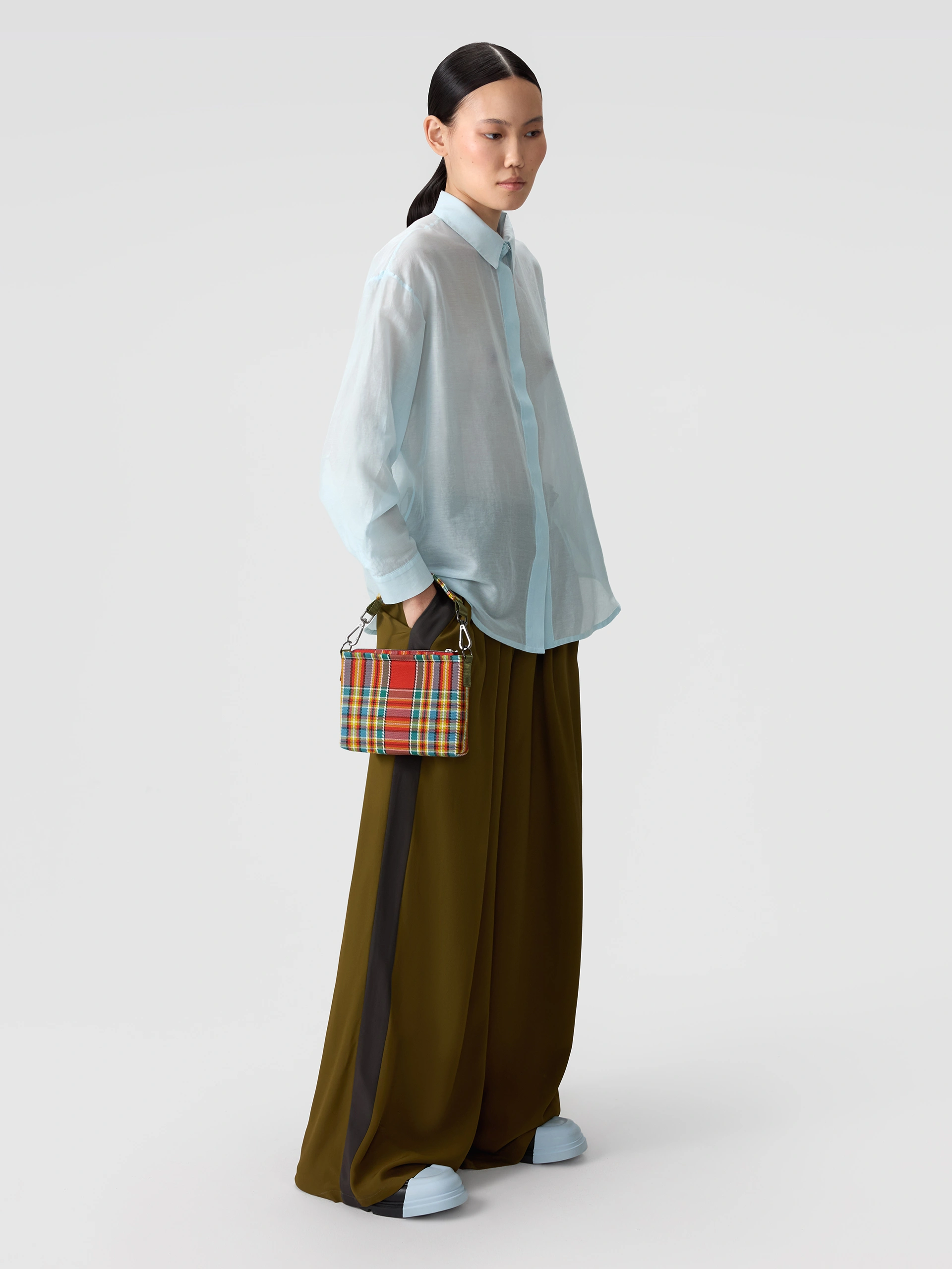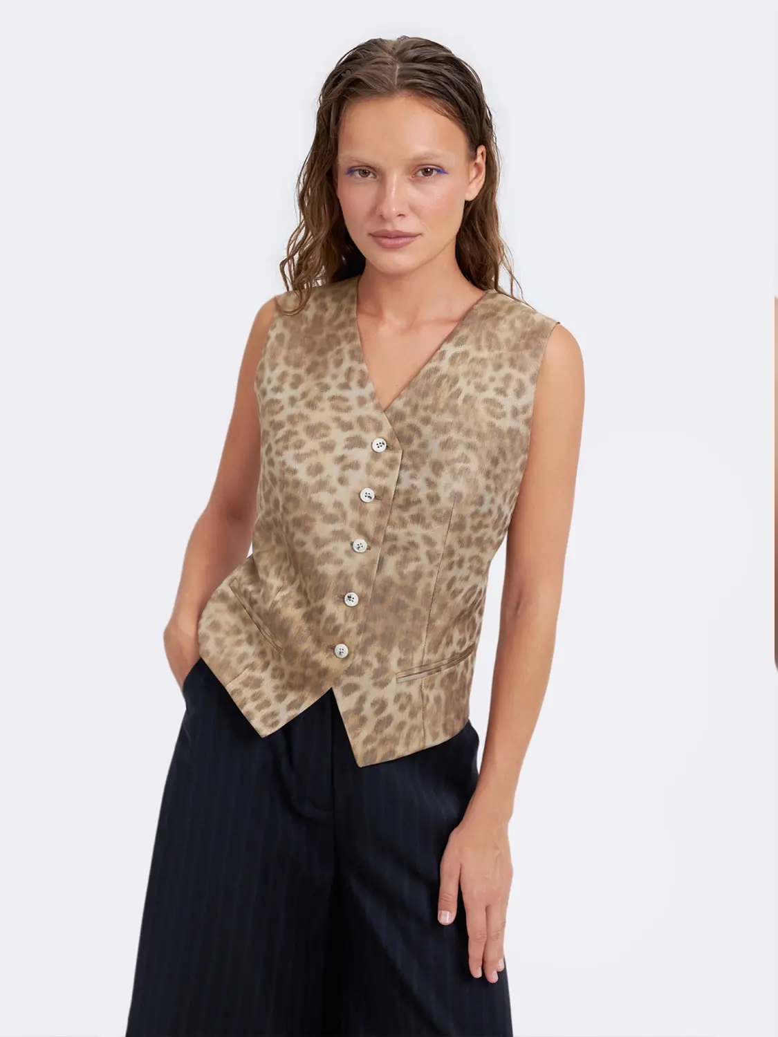 Приталенный жилет из полупрозрачной клетчатой ткани с отрезной линией талии и ярусной баской с контрастными вставками по бокам. Однобортная застежка на пуговицы. Английский воротник.