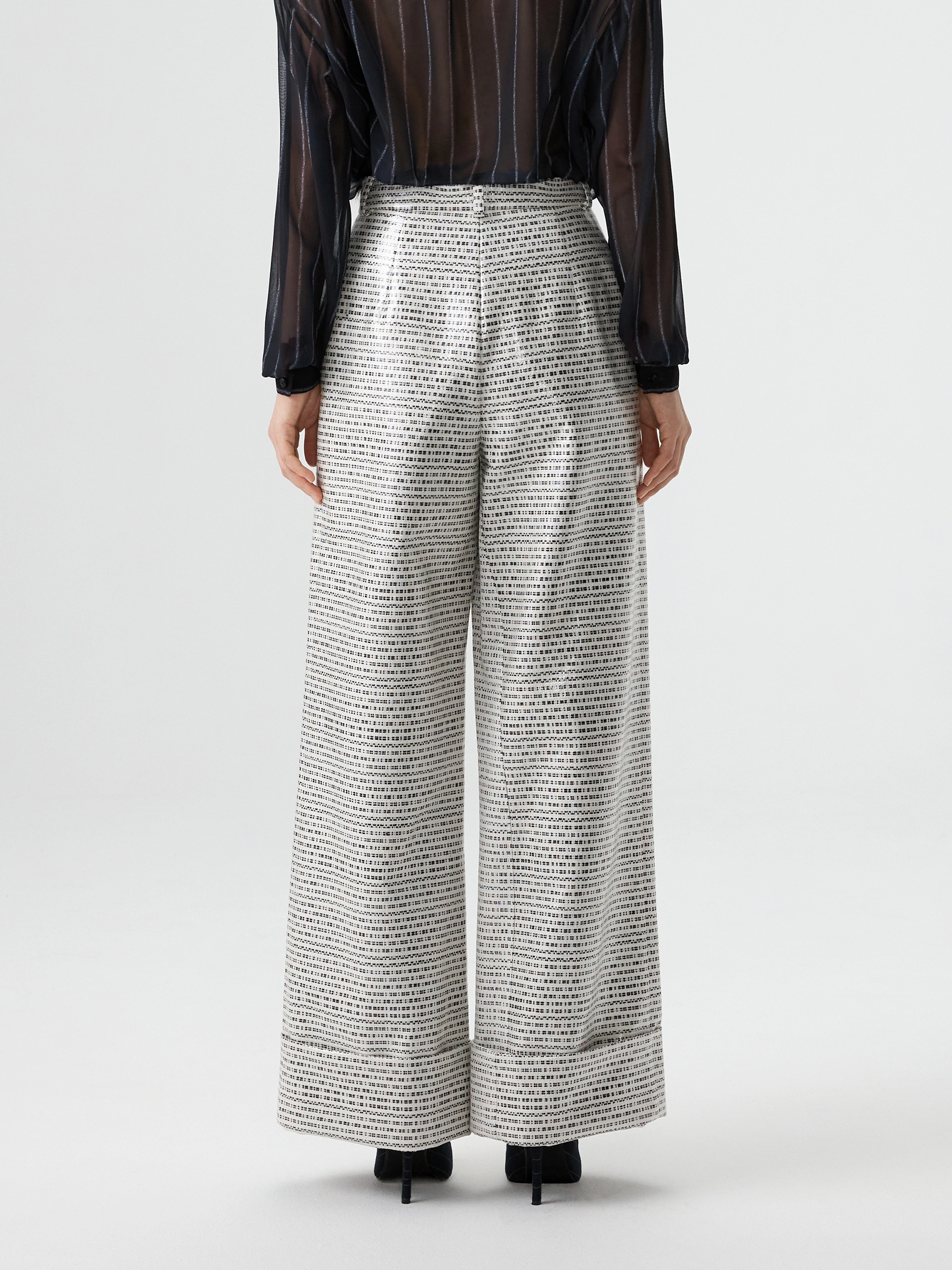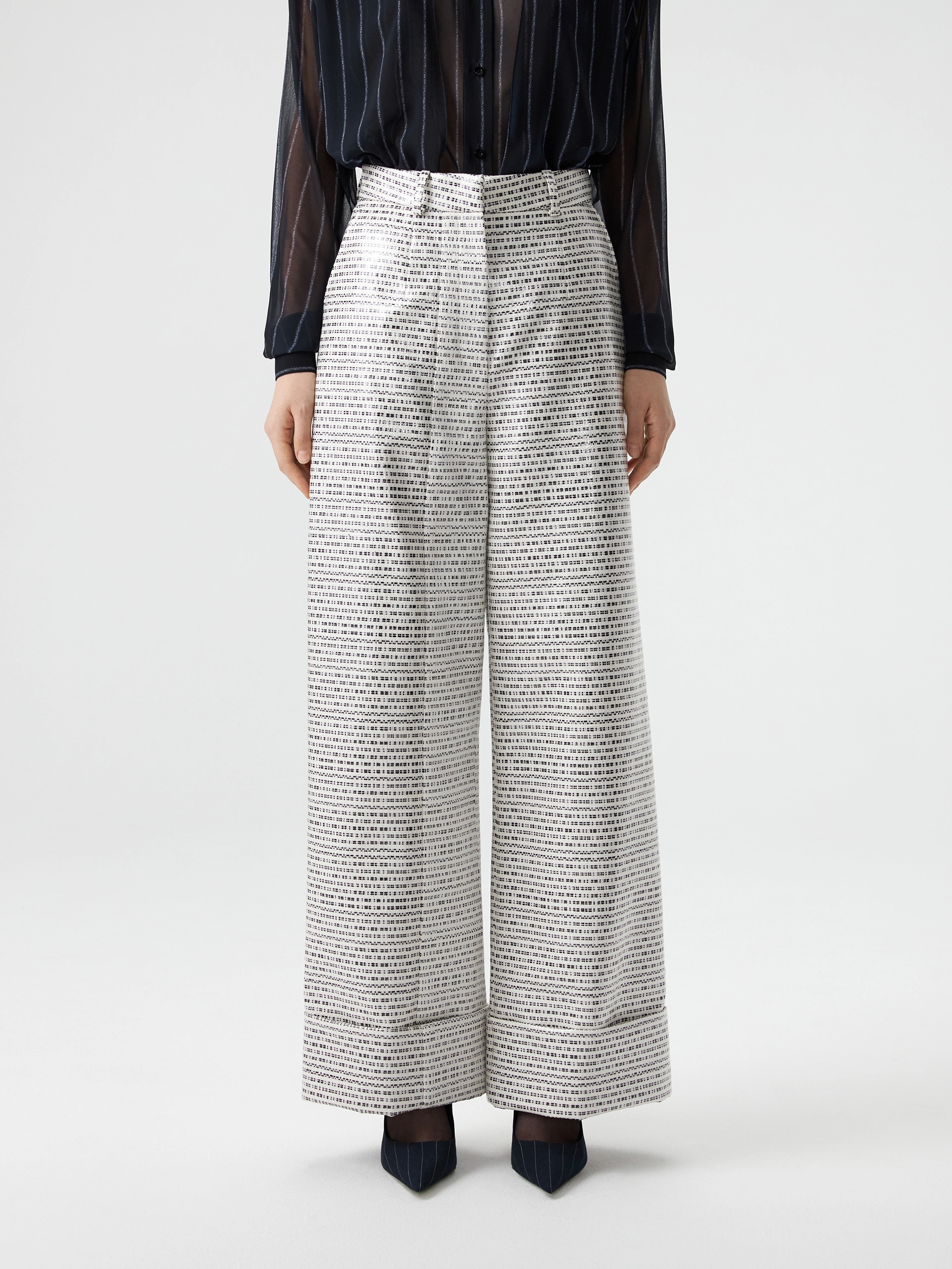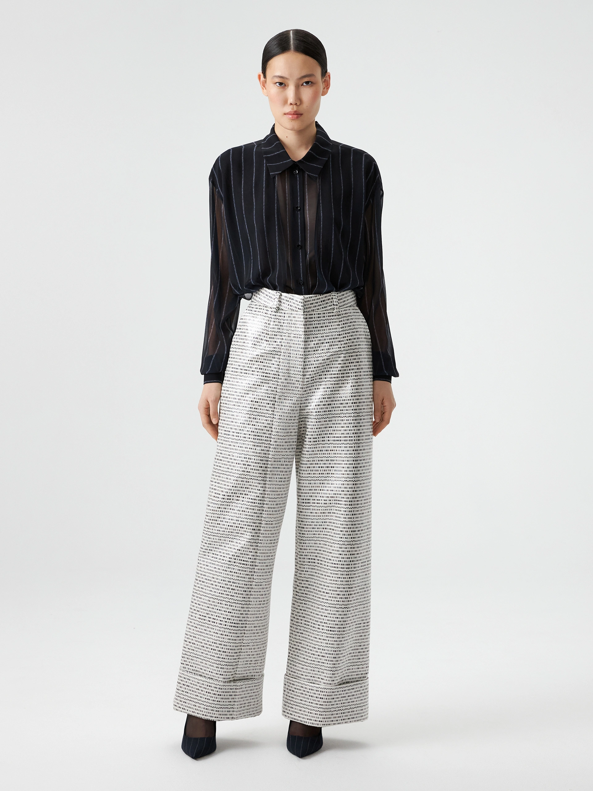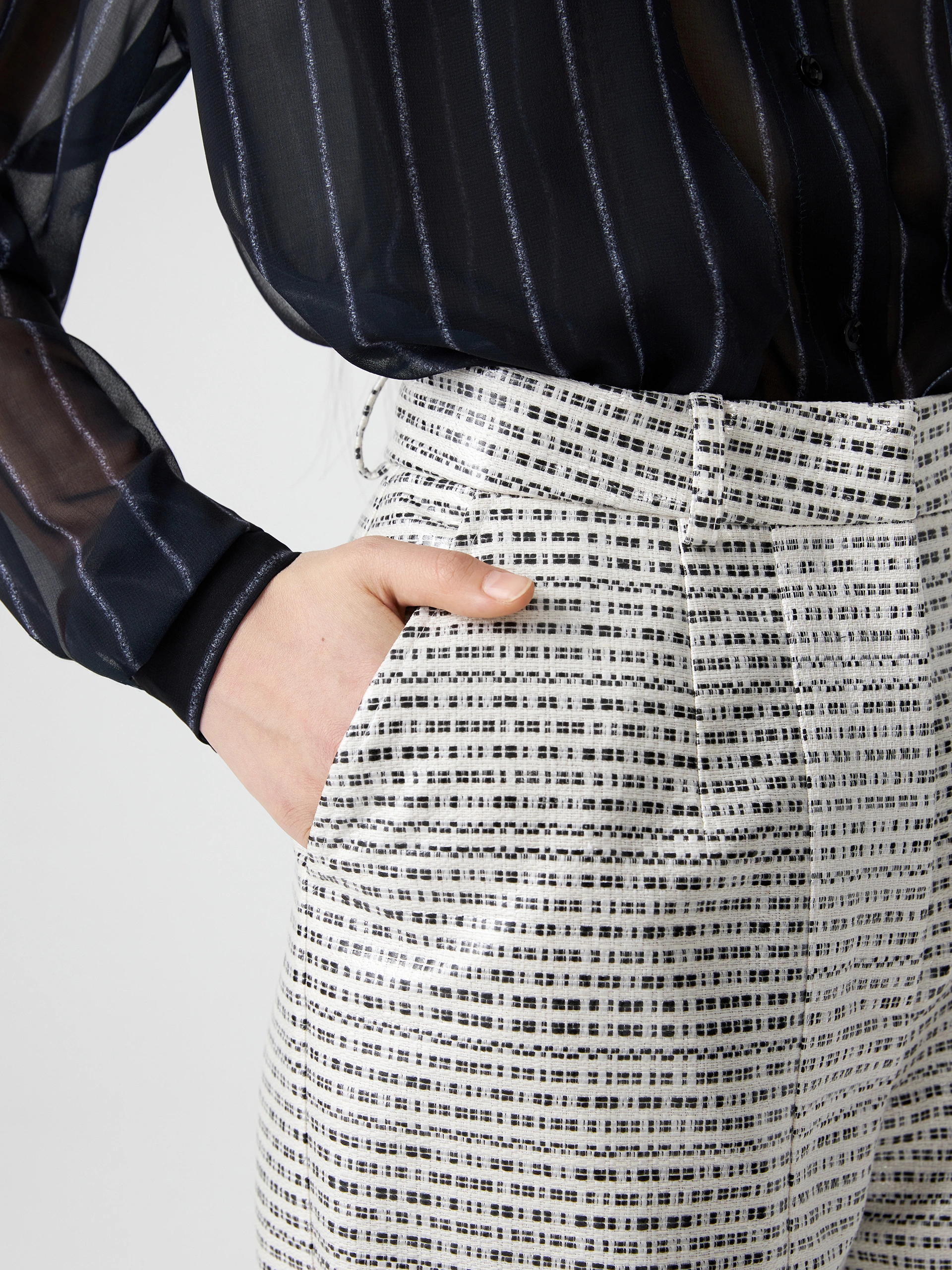 Укороченные брюки унисекс в полоску из хлопка. Некоторые полоски из контрастных тканей. Пояс на резинке, брюки слегка заужаются.