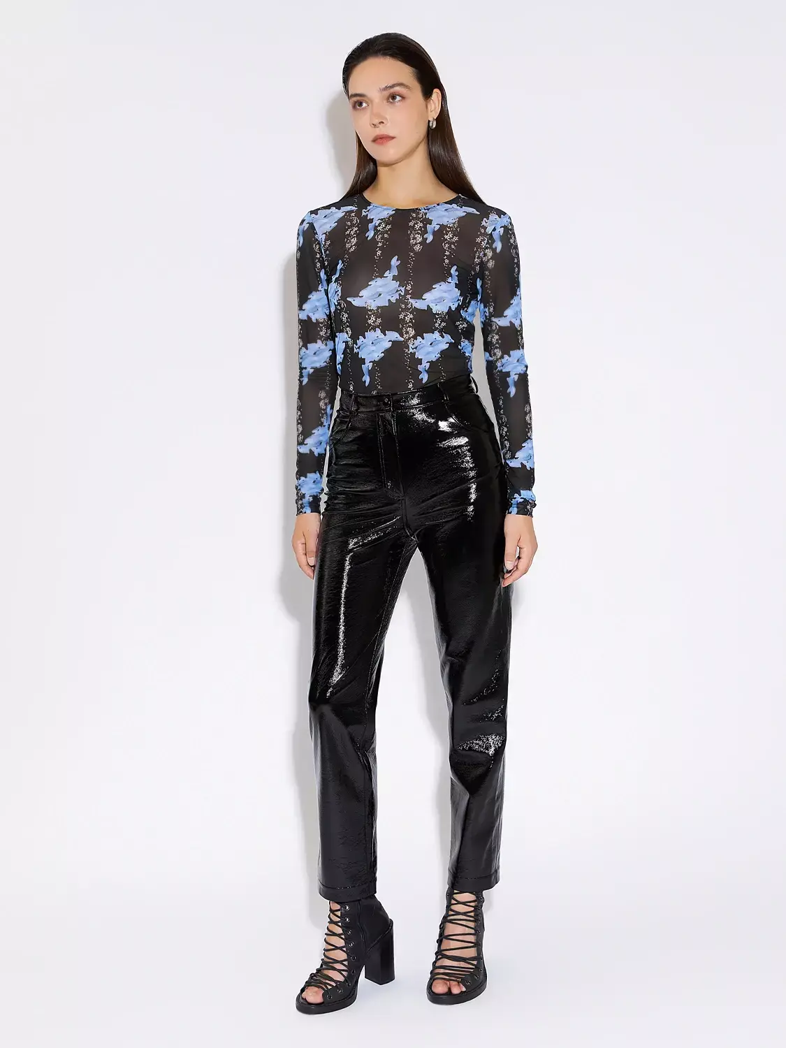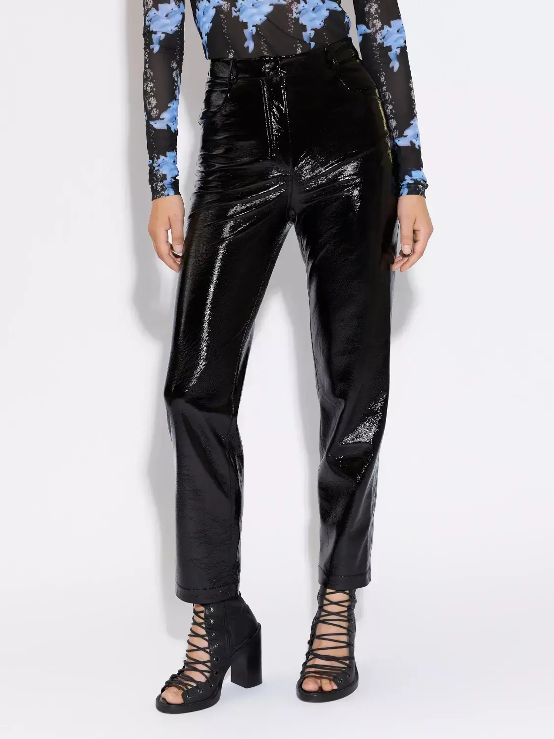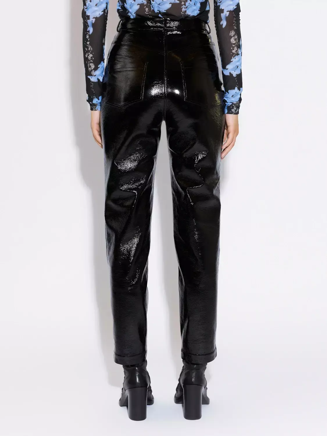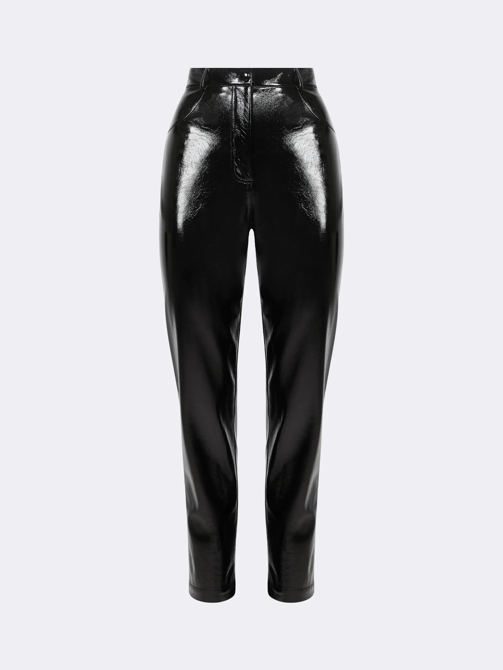 Брюки зауженного кроя из лакированной экокожи на хлопковой основе. Высокая посадка, застёжка спереди на пуговицу и молнию, боковые и накладные задние карманы. Пояс оснащён шлевками для ремня.