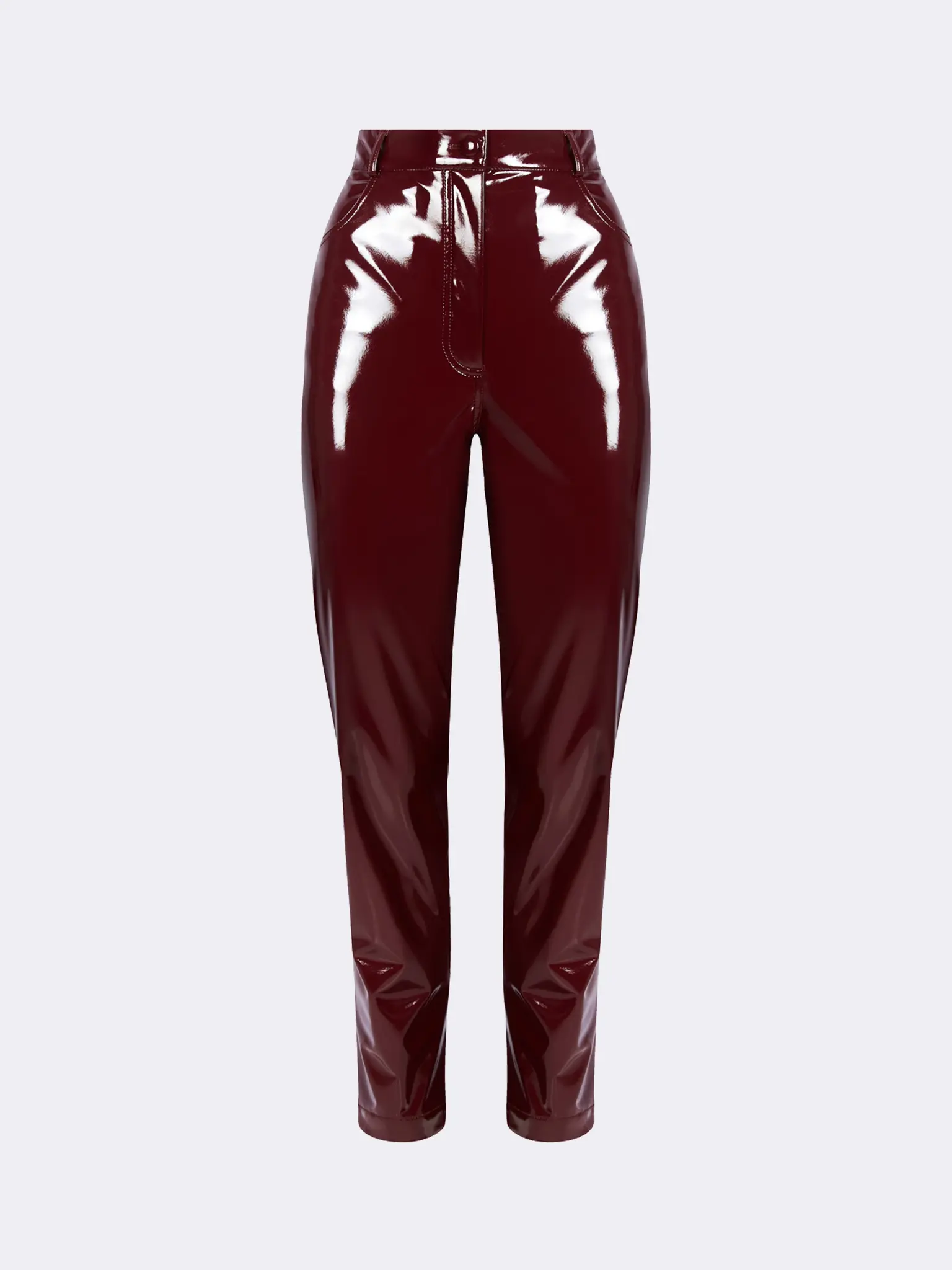 Брюки зауженного кроя из лакированной экокожи на хлопковой основе. Высокая посадка, застёжка спереди на пуговицу и молнию, боковые и накладные задние карманы. Пояс оснащён шлевками для ремня.