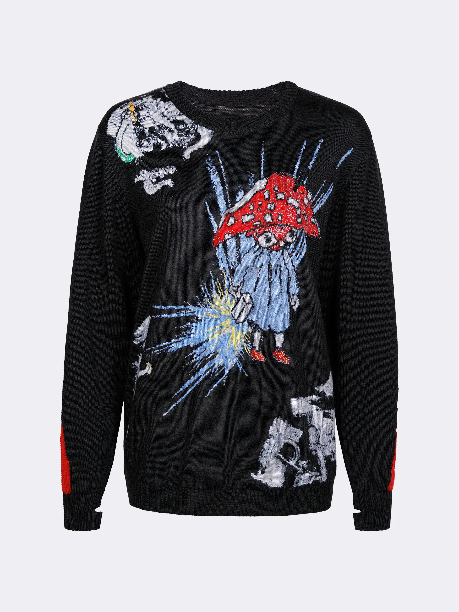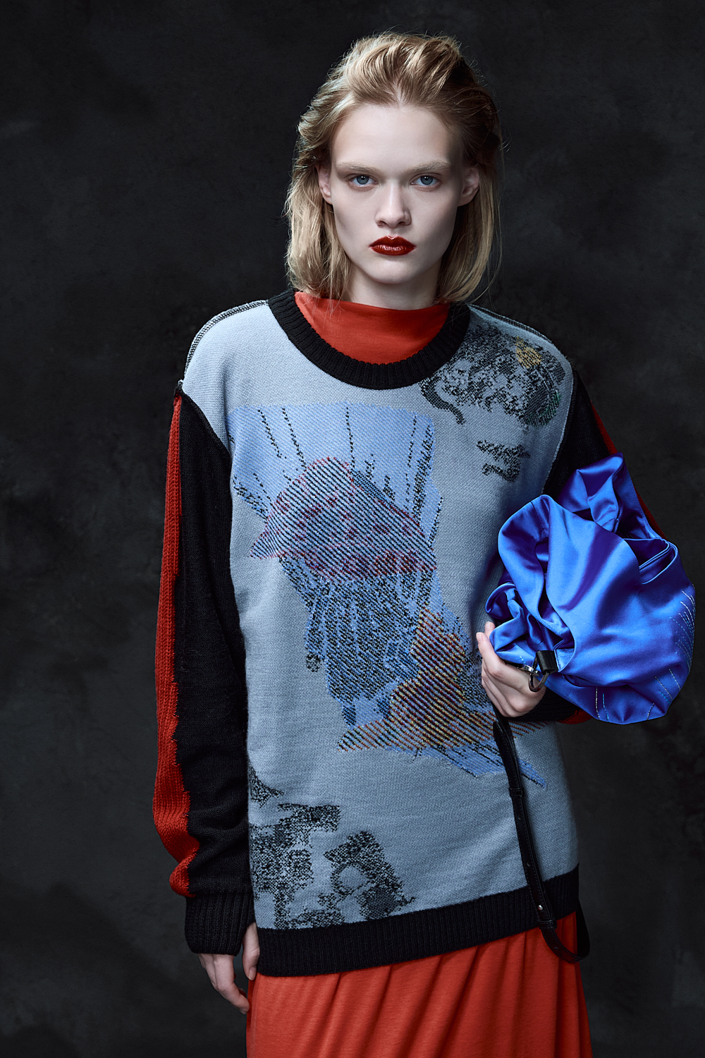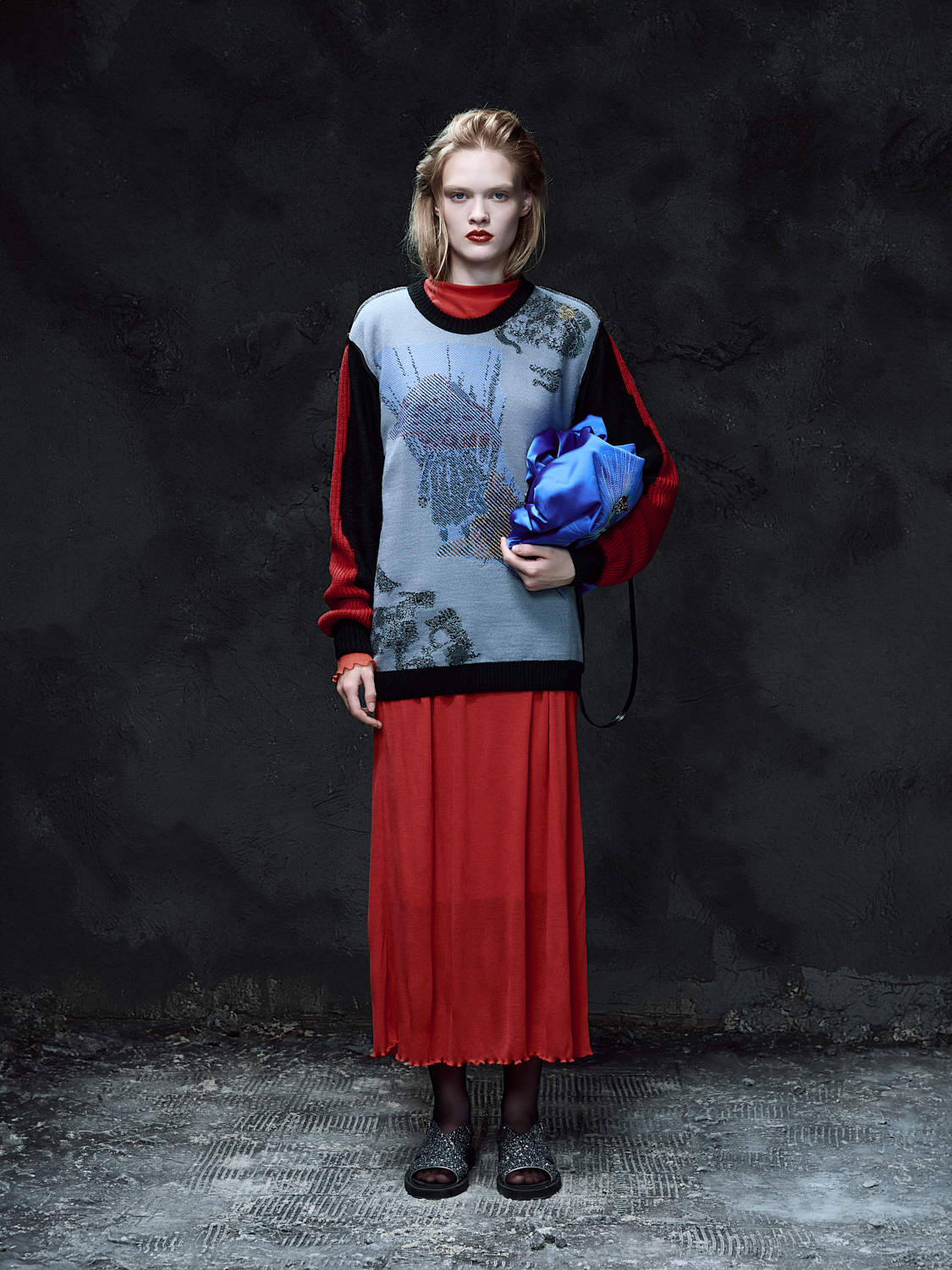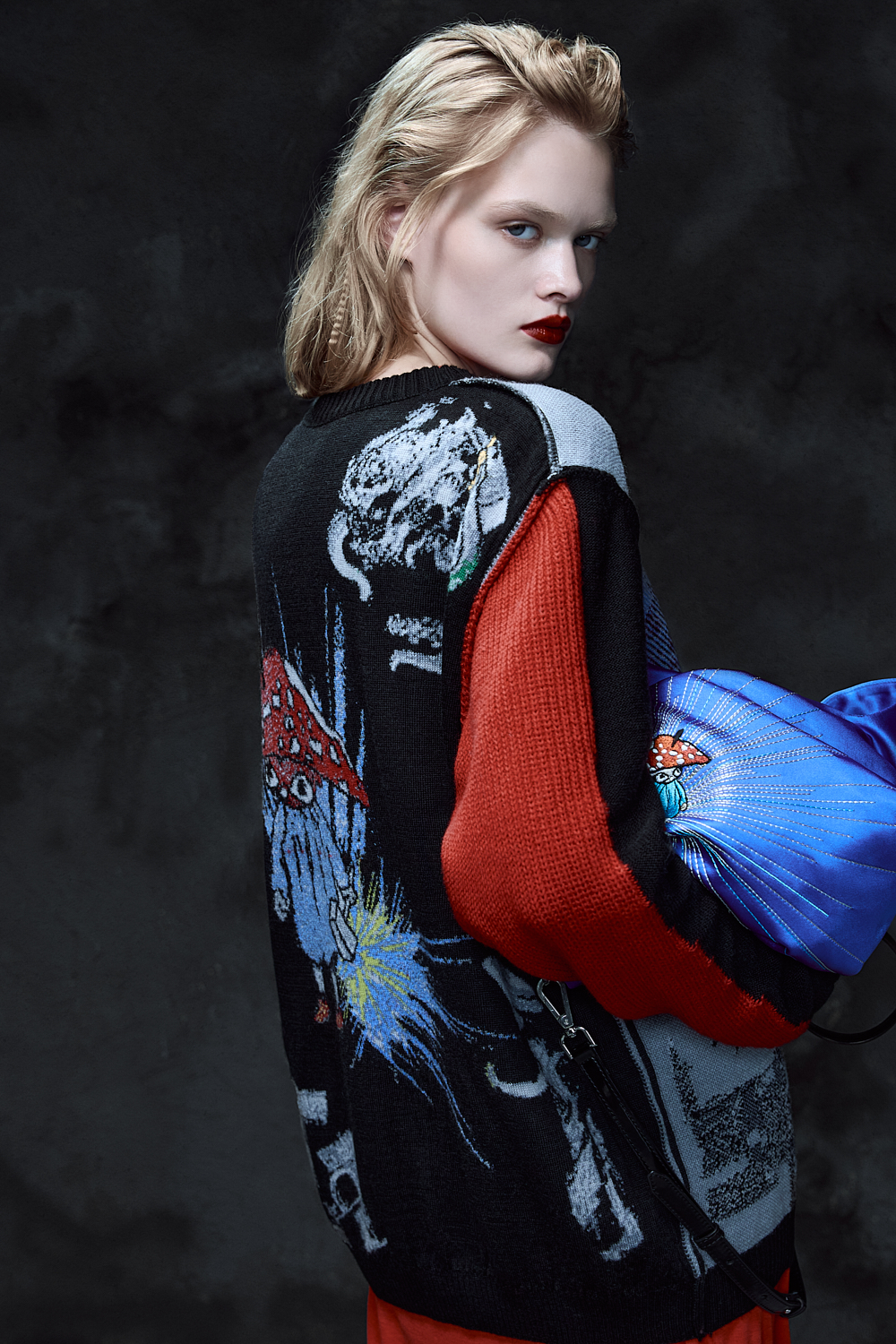 Свитер из мягкого однотонного трикотажа с контрастными вставками крупной вязки на рукавах. Свободный силуэт, спущенная линия плеча. V-образное декольте, вырезы на рукавах и манжетах. Манжеты, низ и горловина связаны резинкой.