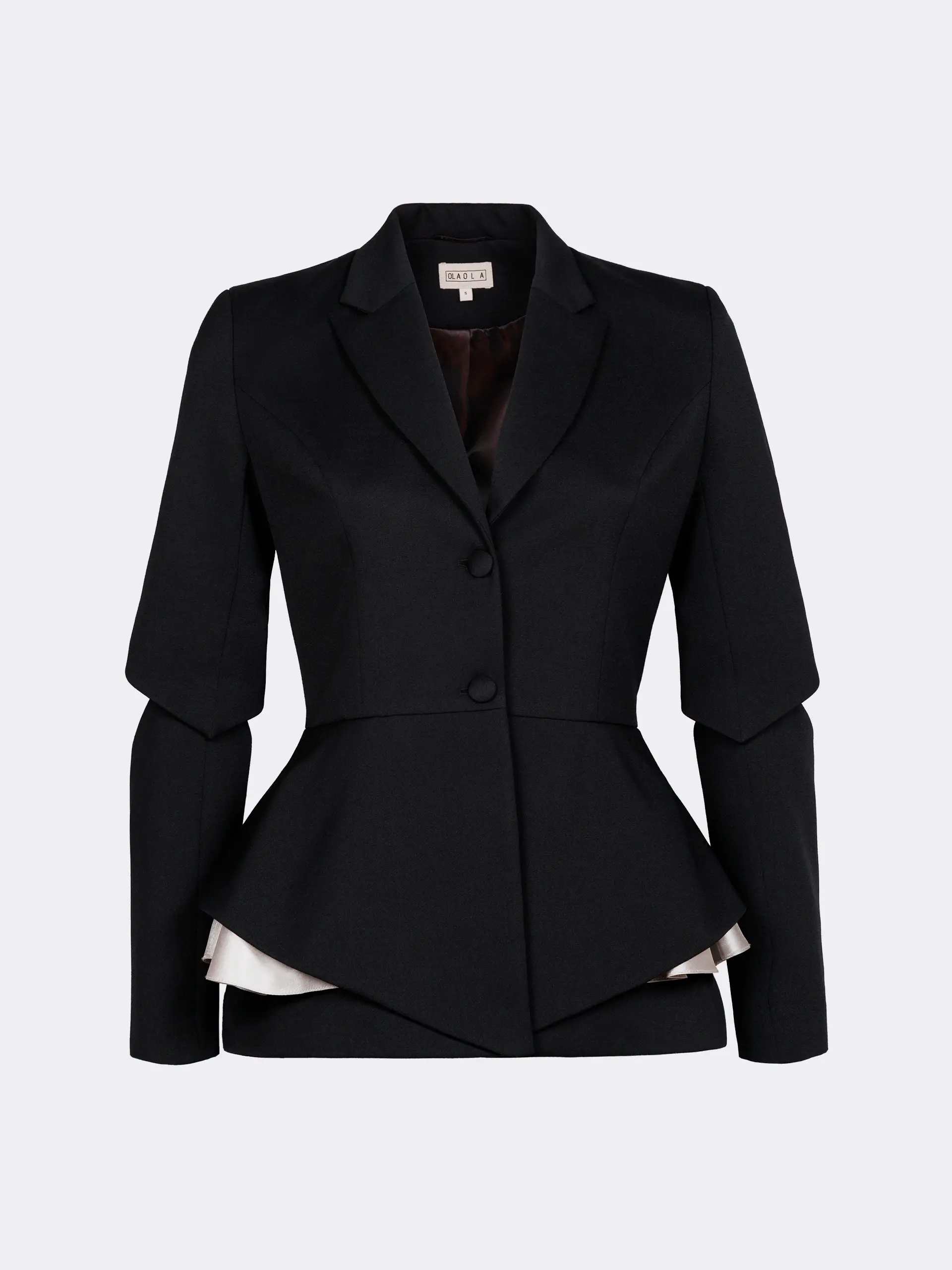 Двубортный жакет приталенного силуэта из принтованной костюмной шерсти. Спереди и на манжетах пуговицы, обтянутые тканью. Спереди предусмотрены карманы с клапанами. На полочках и рукавах машинная вышивка, дополненная ручной вышивкой стеклярусом. Жакет на подкладке. Принт создан в коллаборации с художником Владимиром Григом.