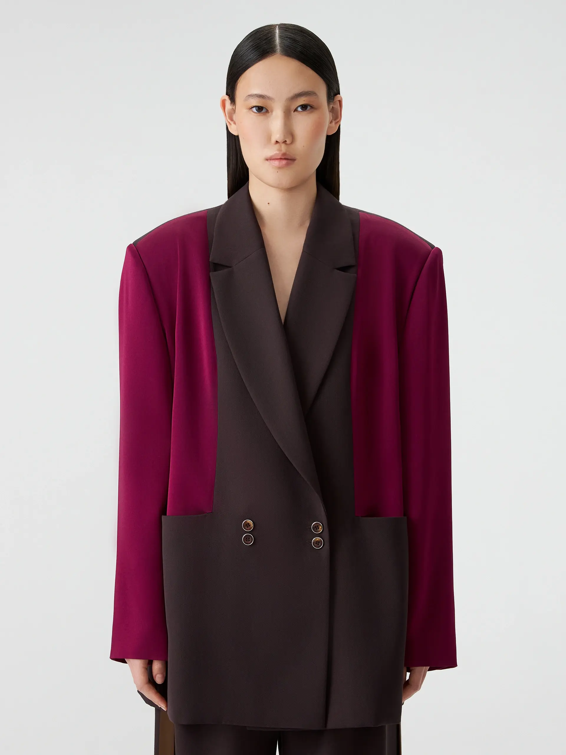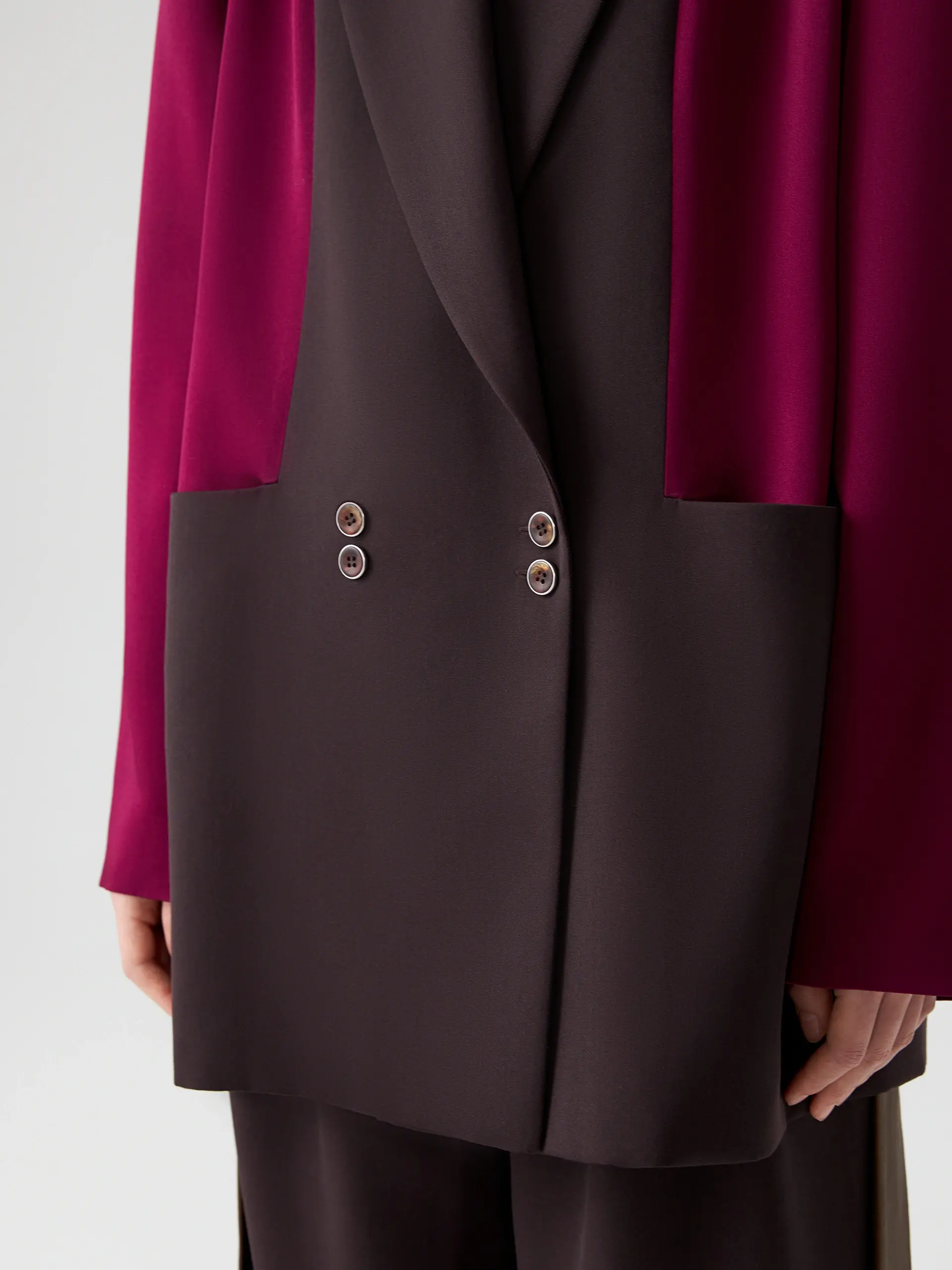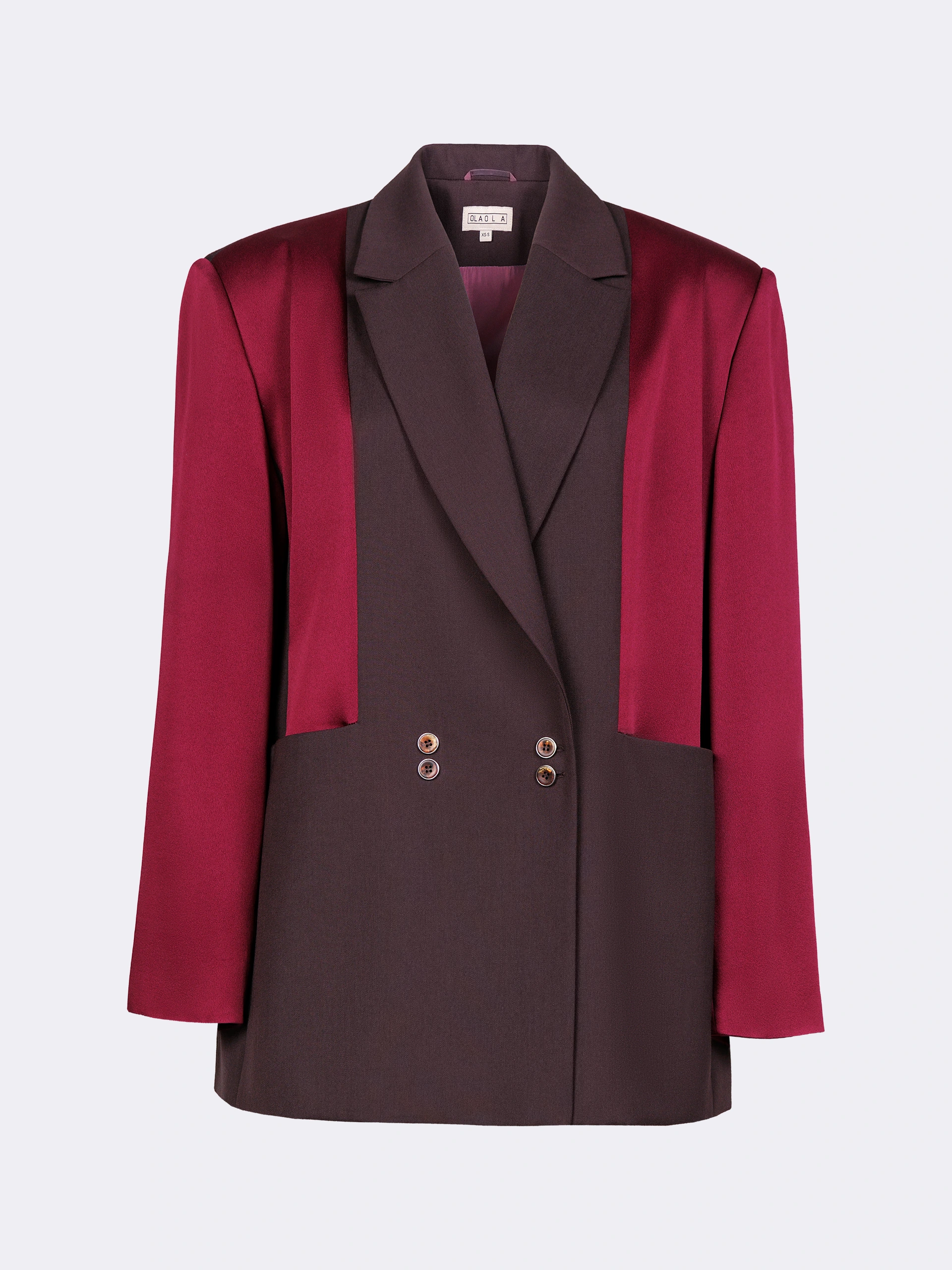 Двубортный оверсайз жакет на подкладке. Полочки и рукава из атласной ткани. Два кармана спереди. Декоративные пуговицы на манжетах. Двойная шлица на спинке. Модель унисекс.