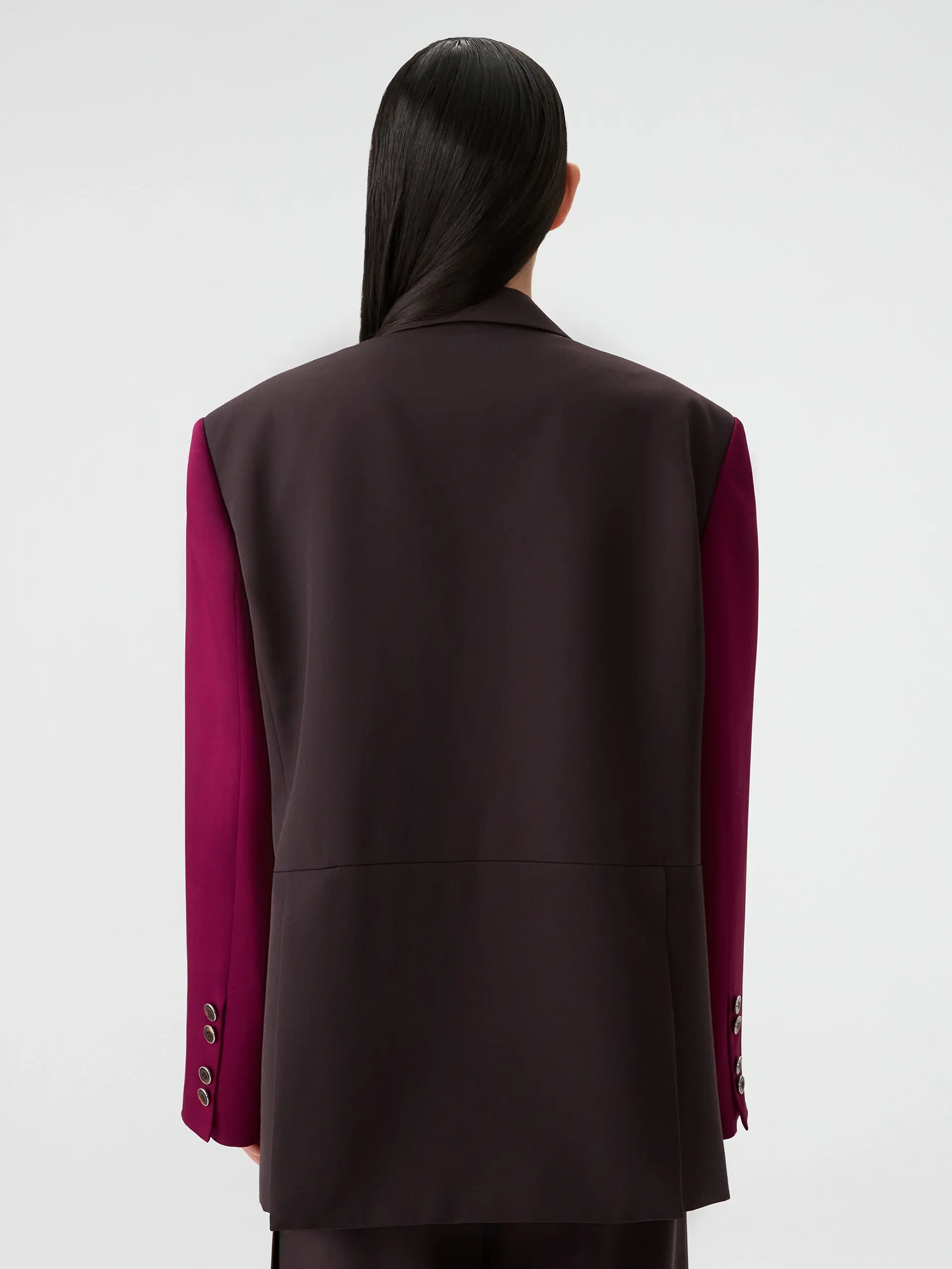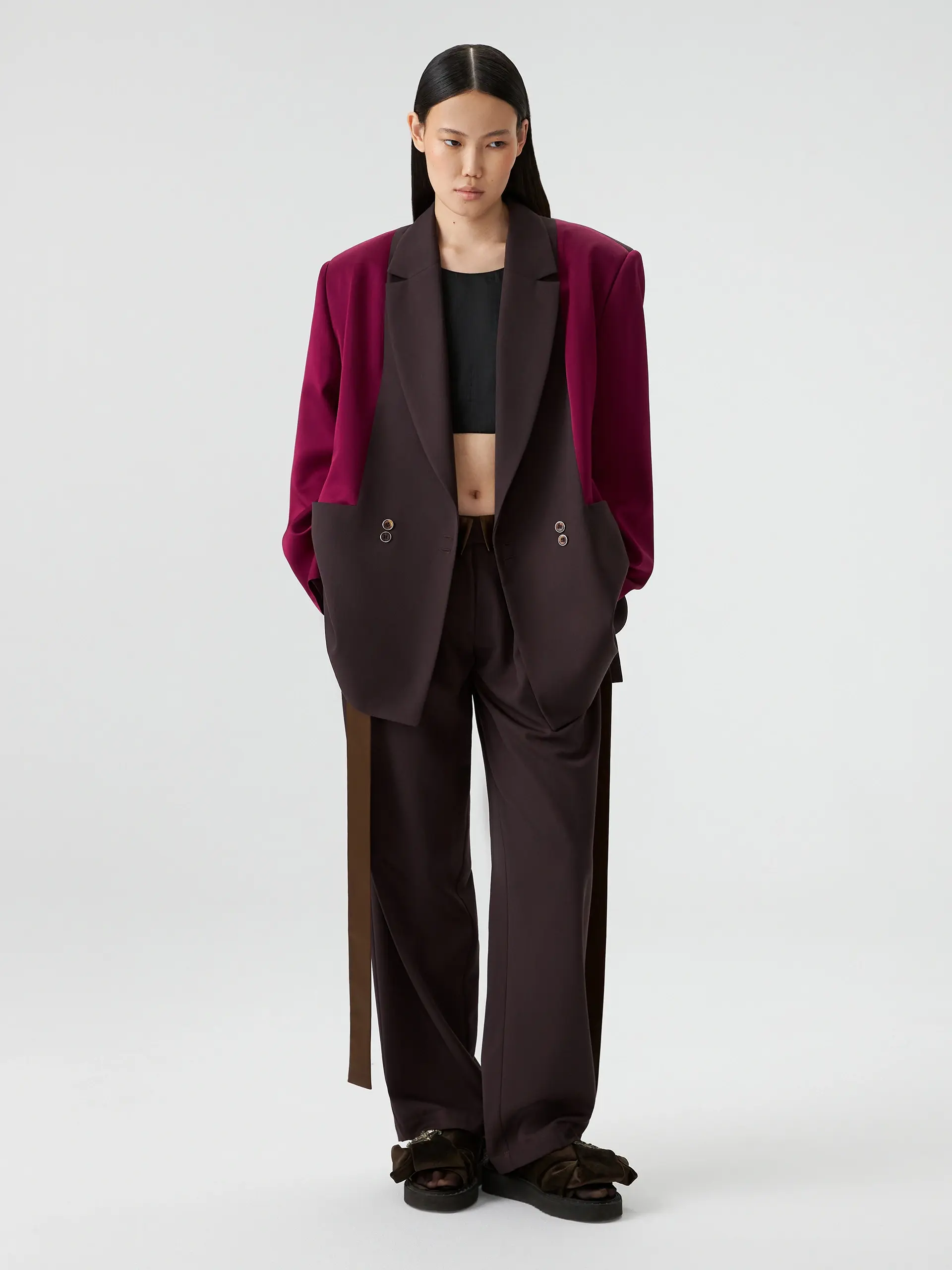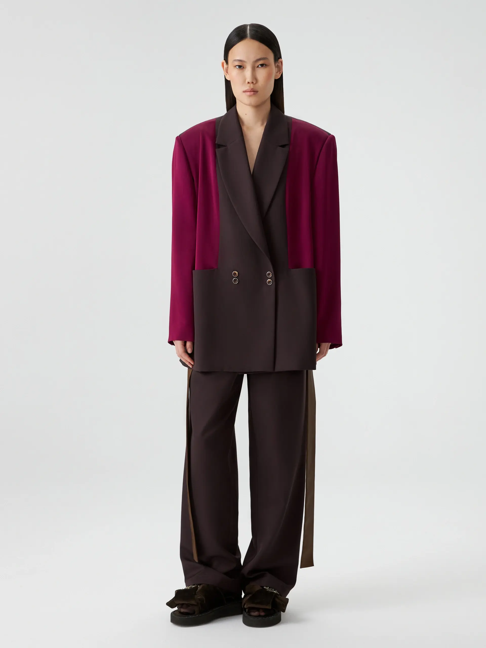 Двубортный оверсайз жакет на подкладке. Полочки и рукава из атласной ткани. Два кармана спереди. Декоративные пуговицы на манжетах. Двойная шлица на спинке. Модель унисекс.