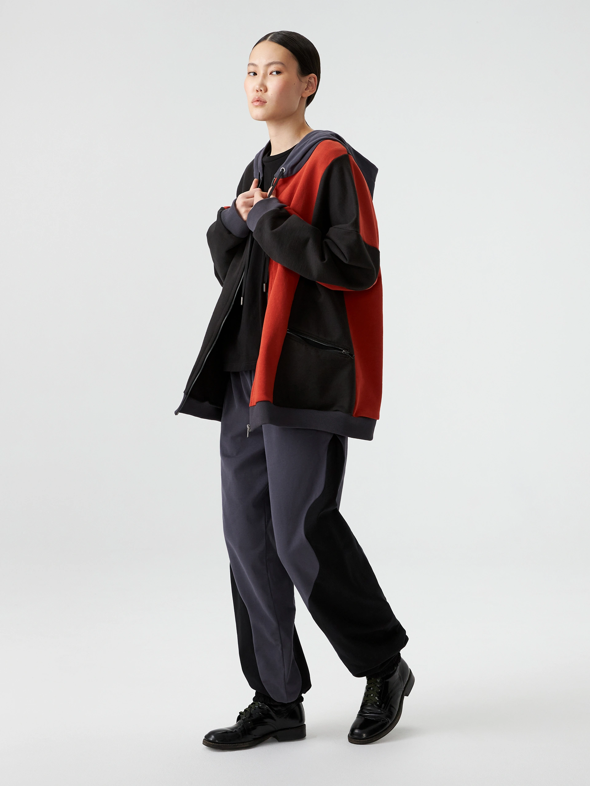 Куртка на молнии из хлопка свободного силуэта. Модель унисекс. Низ и манжеты на резинке. Воротник стойка, рукав реглан со вставками черного цвета.