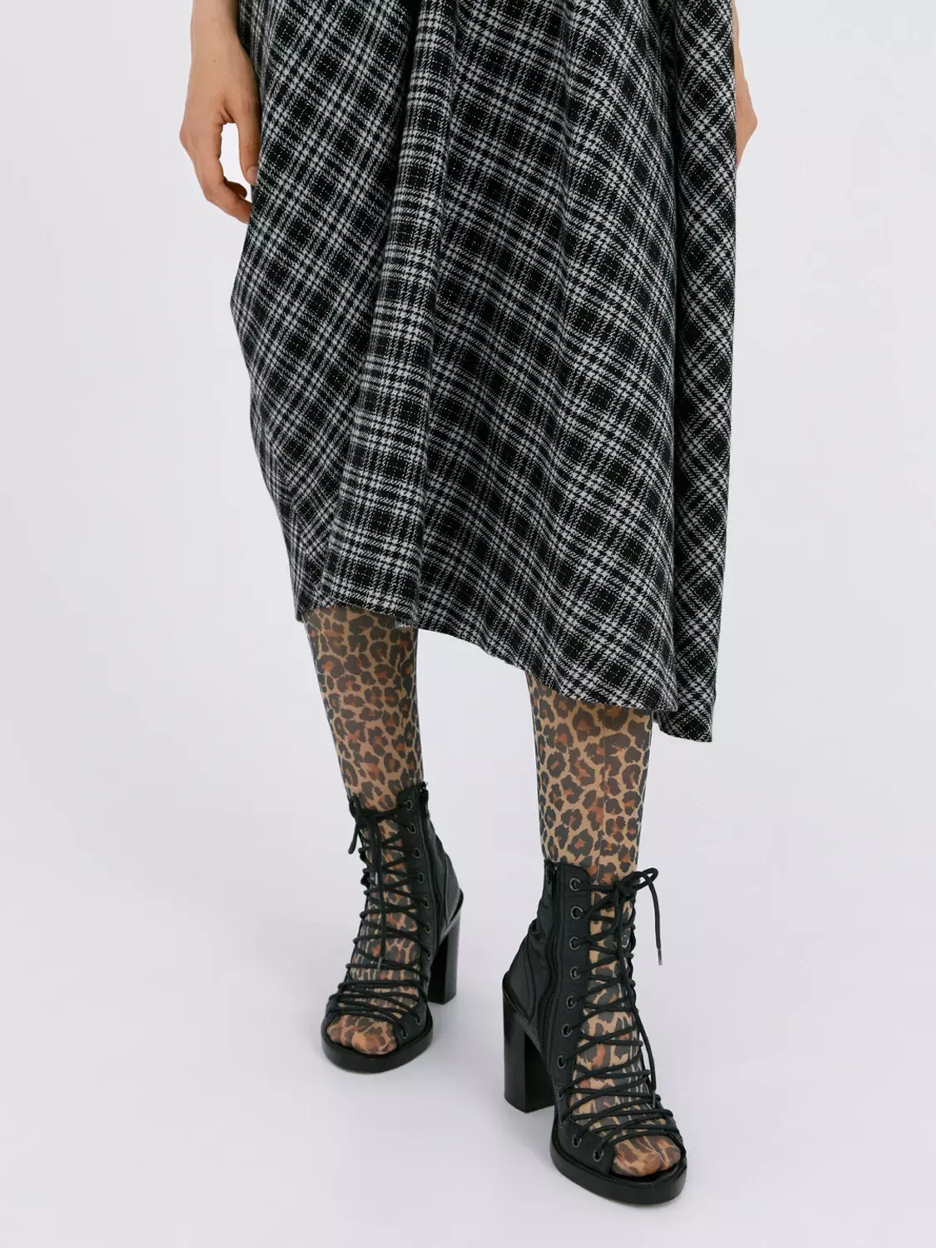 Ассиметричное платье с драпировкой из шерстяной клетчатой ткани. Объемный отложной воротник, часть воротника выполнена из красной контрастной ткани в цвет паты на правом рукаве. Карман в левом боковом шве.
