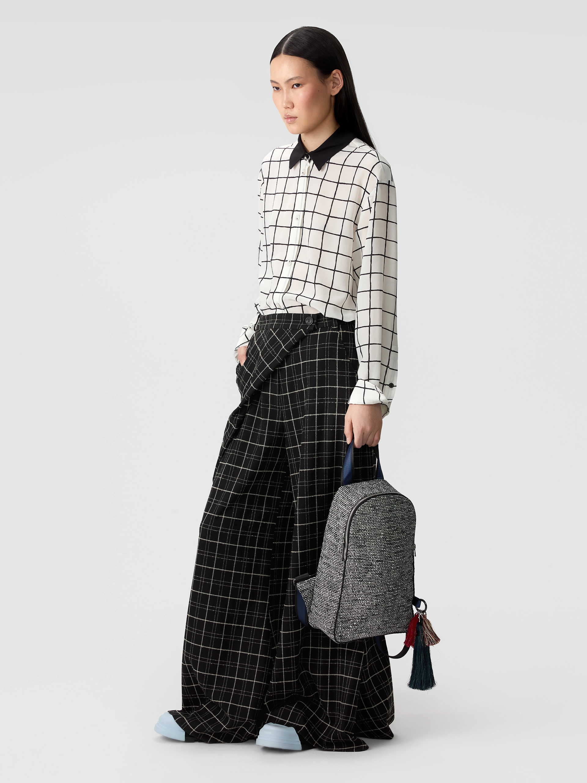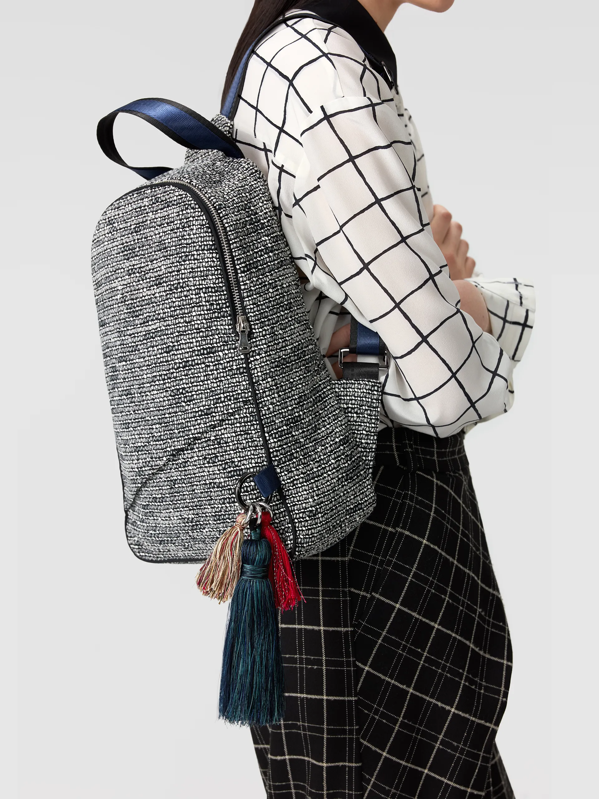 Рюкзак из ткани в стиле пэчворк из микса блестящих лоскутов. Застёжка на молнию, регулируемые лямки. Одно отделение с внутренним карманом. Внешний карман на молнии под планкой. Есть подкладка. Сбоку декоративное кольцо-карабин для крепления брелоков.