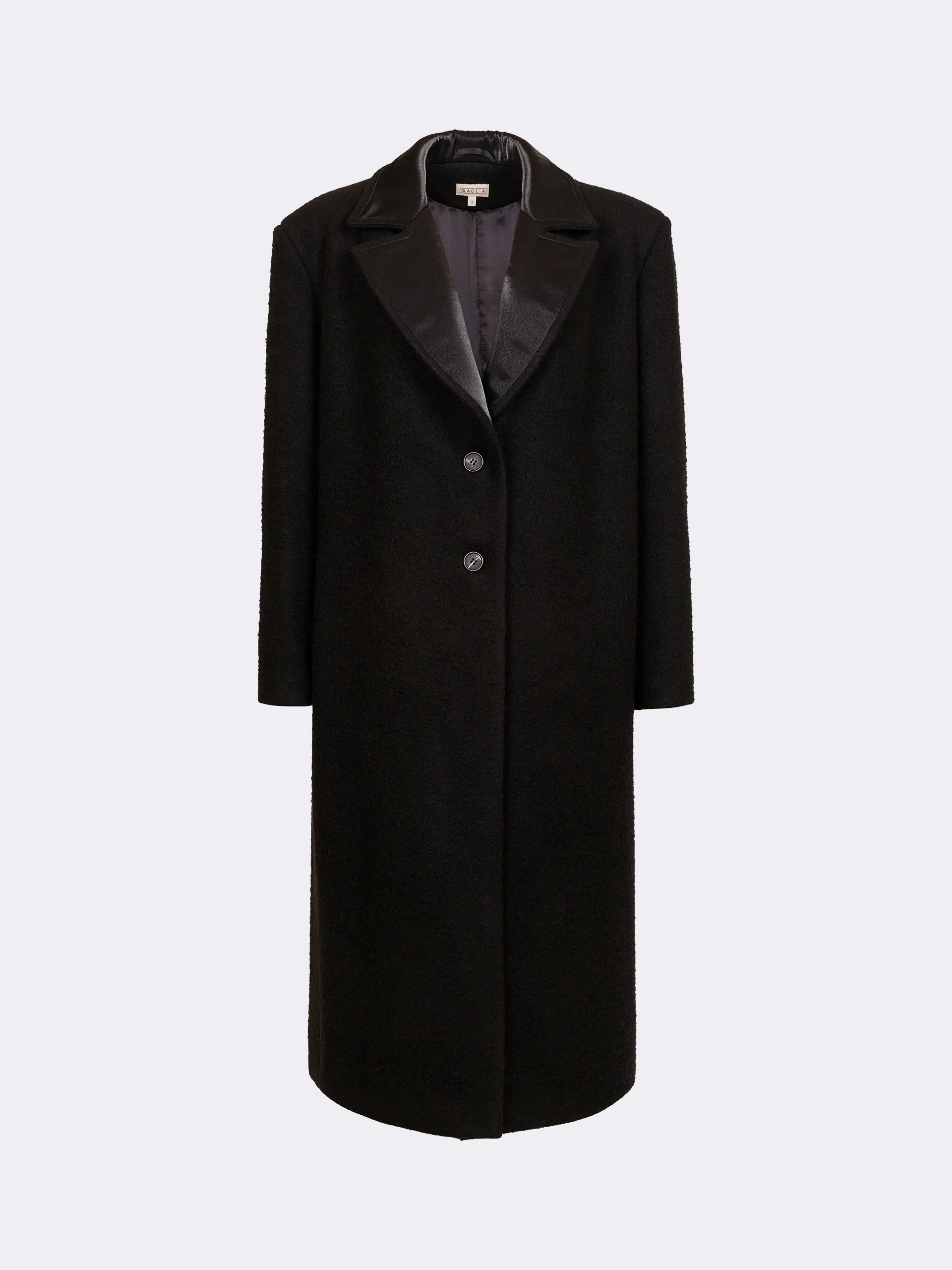 Однобортное пальто-халат из фактурной смесовой шерсти с поясом. Английский воротник из контрастной атласной ткани. Есть шлёвки для ремня. Разрезы на плечах со вставками из атласной ткани создают эффект деконструкции рукава. Боковые карманы с листочкой. Застёжка на пуговицы. Шлица сзади. Модель на подкладке.