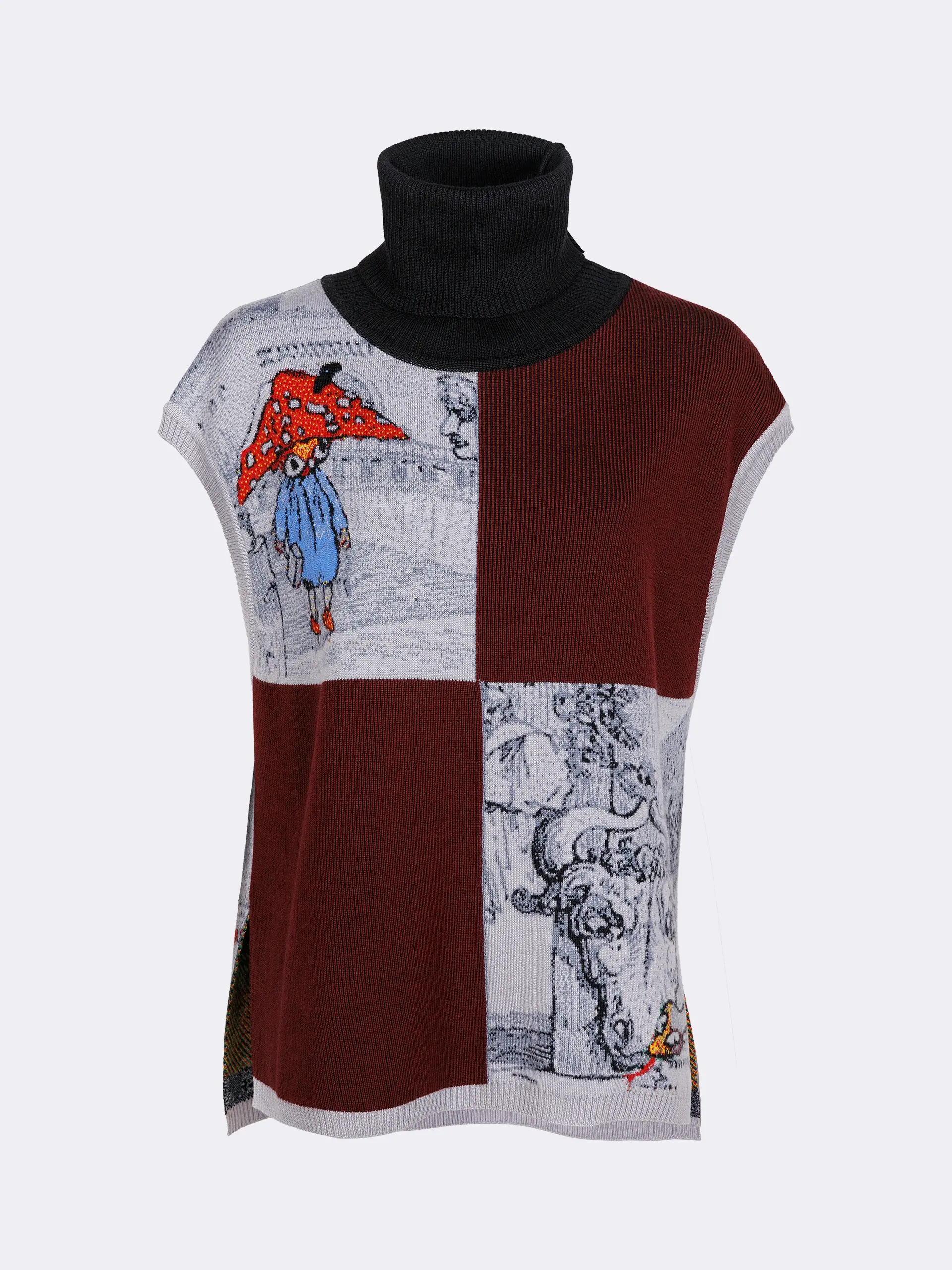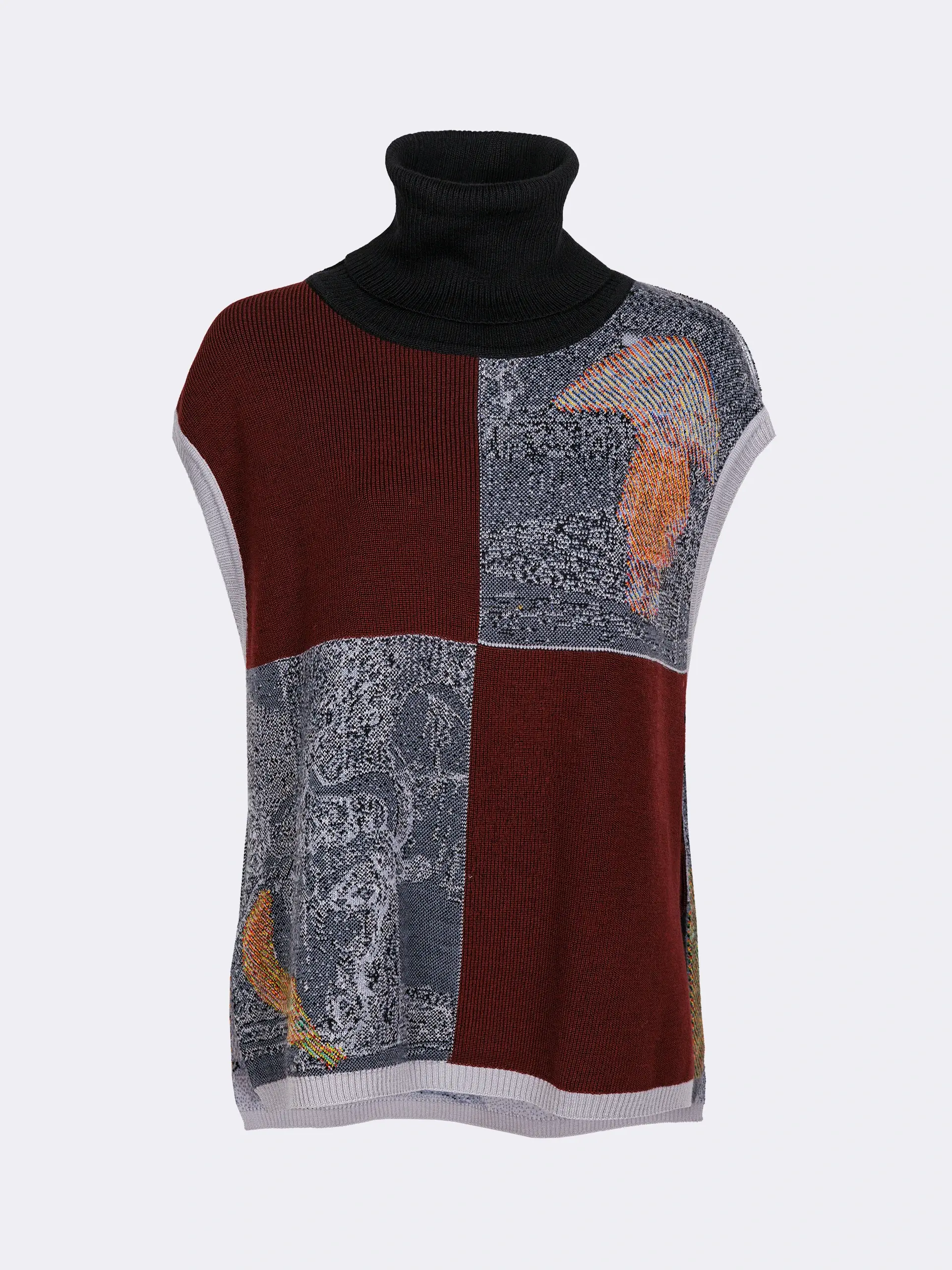 Двусторонний трикотажный жилет с контрастным графичным принтом свободного силуэта. Спущенная линия плеча, воротник-стойка, край рукава и низ изделия связаны резинкой. Принт создан в коллаборации с художником Владимиром Григом.