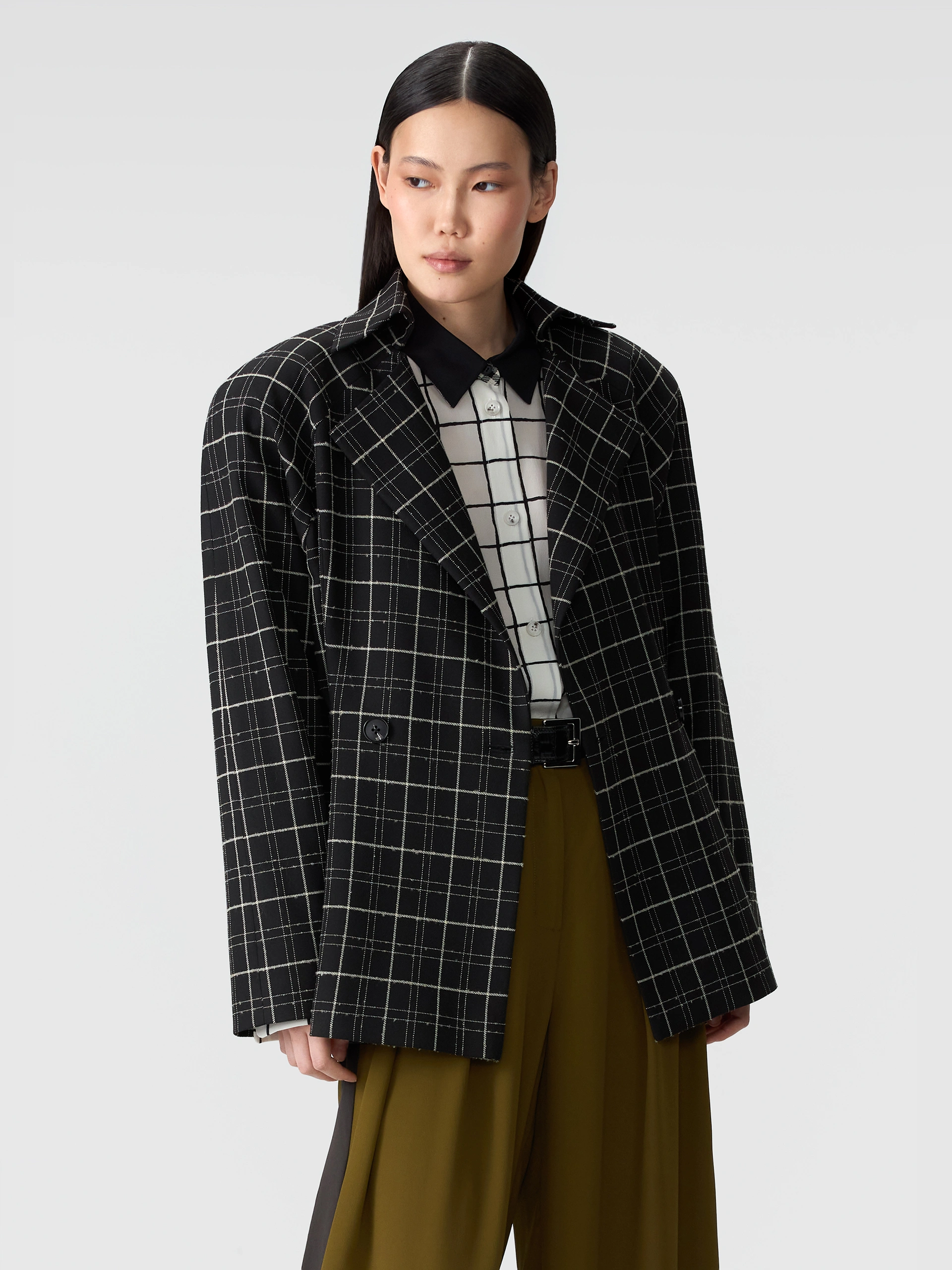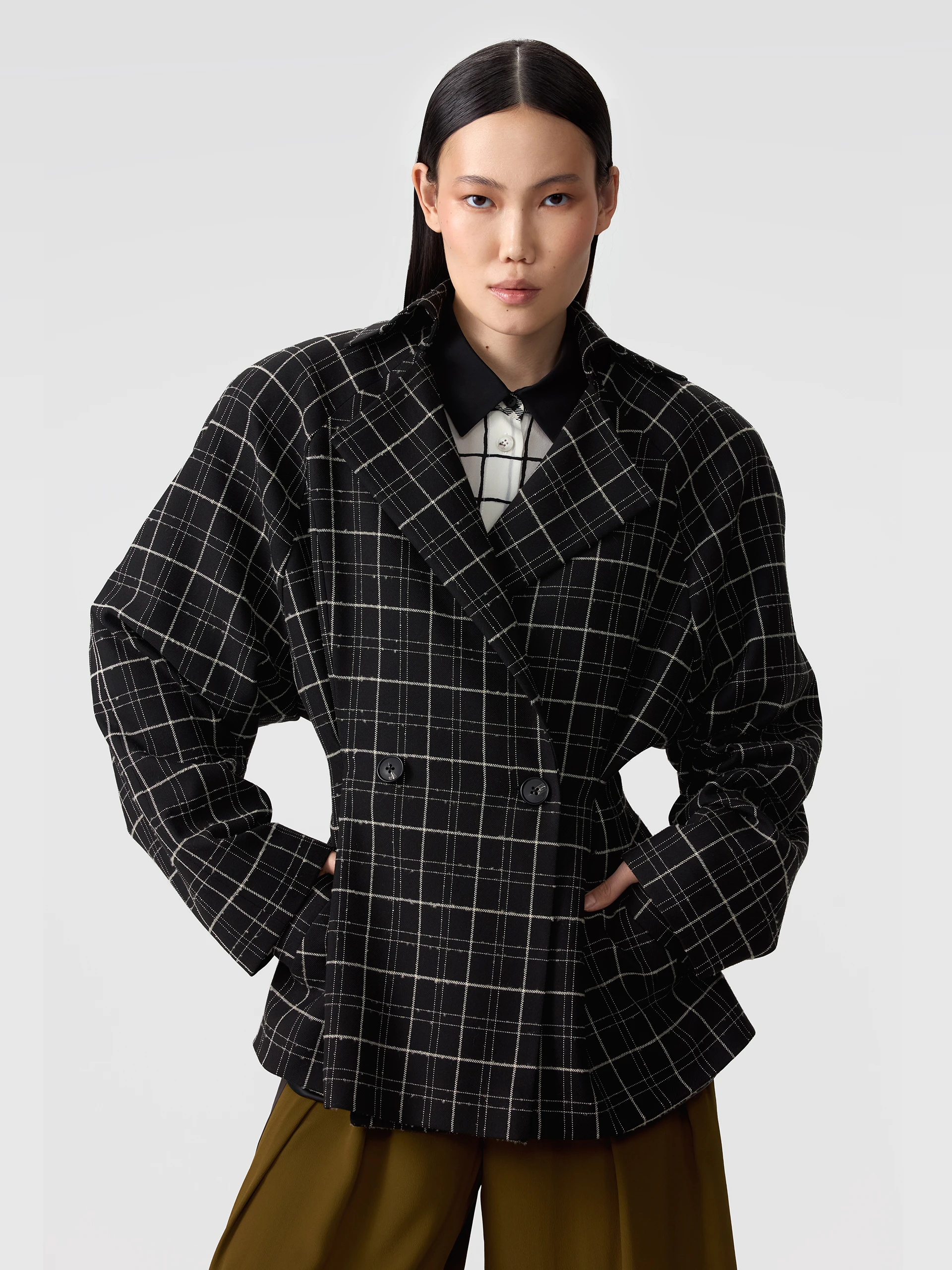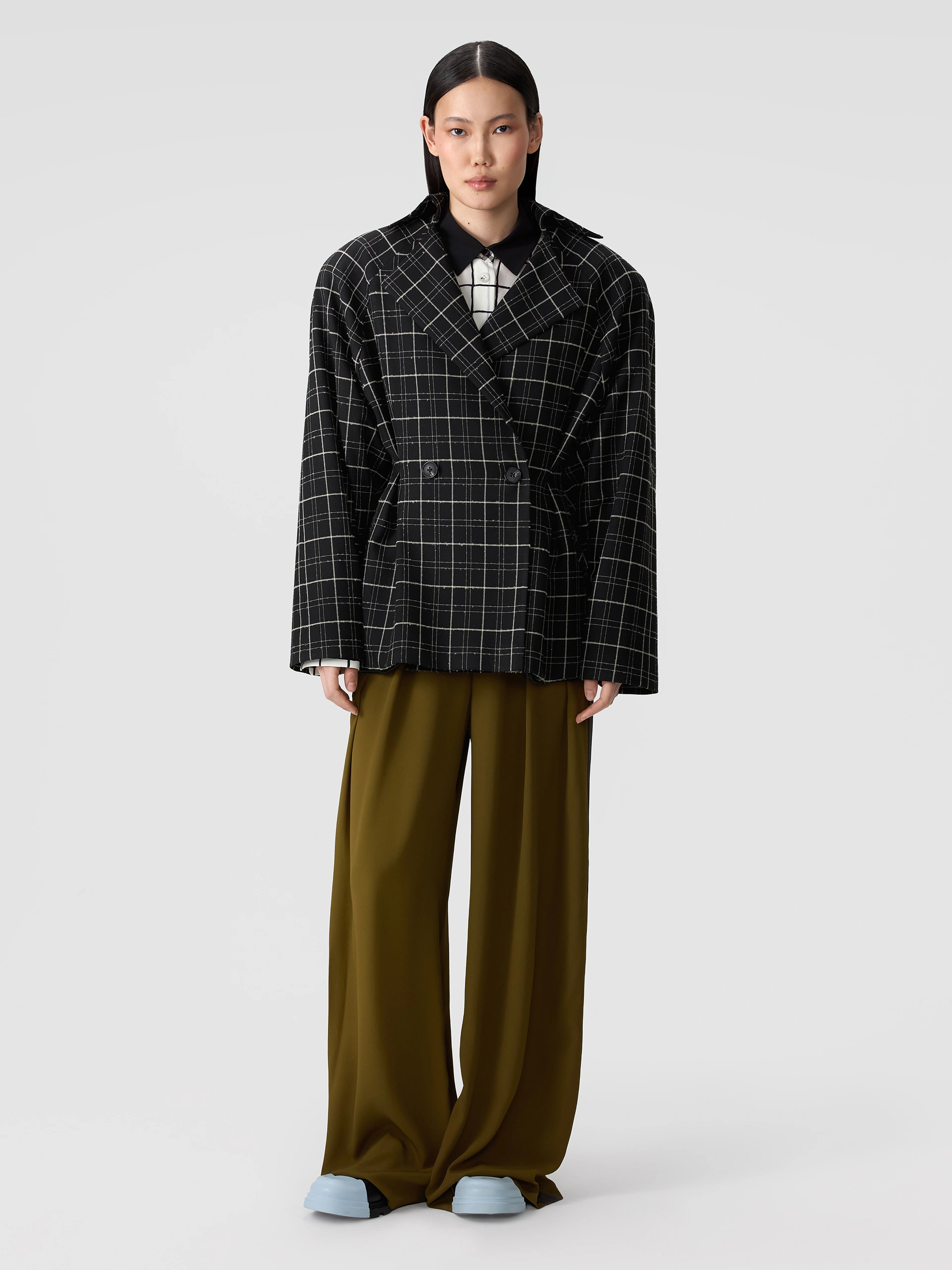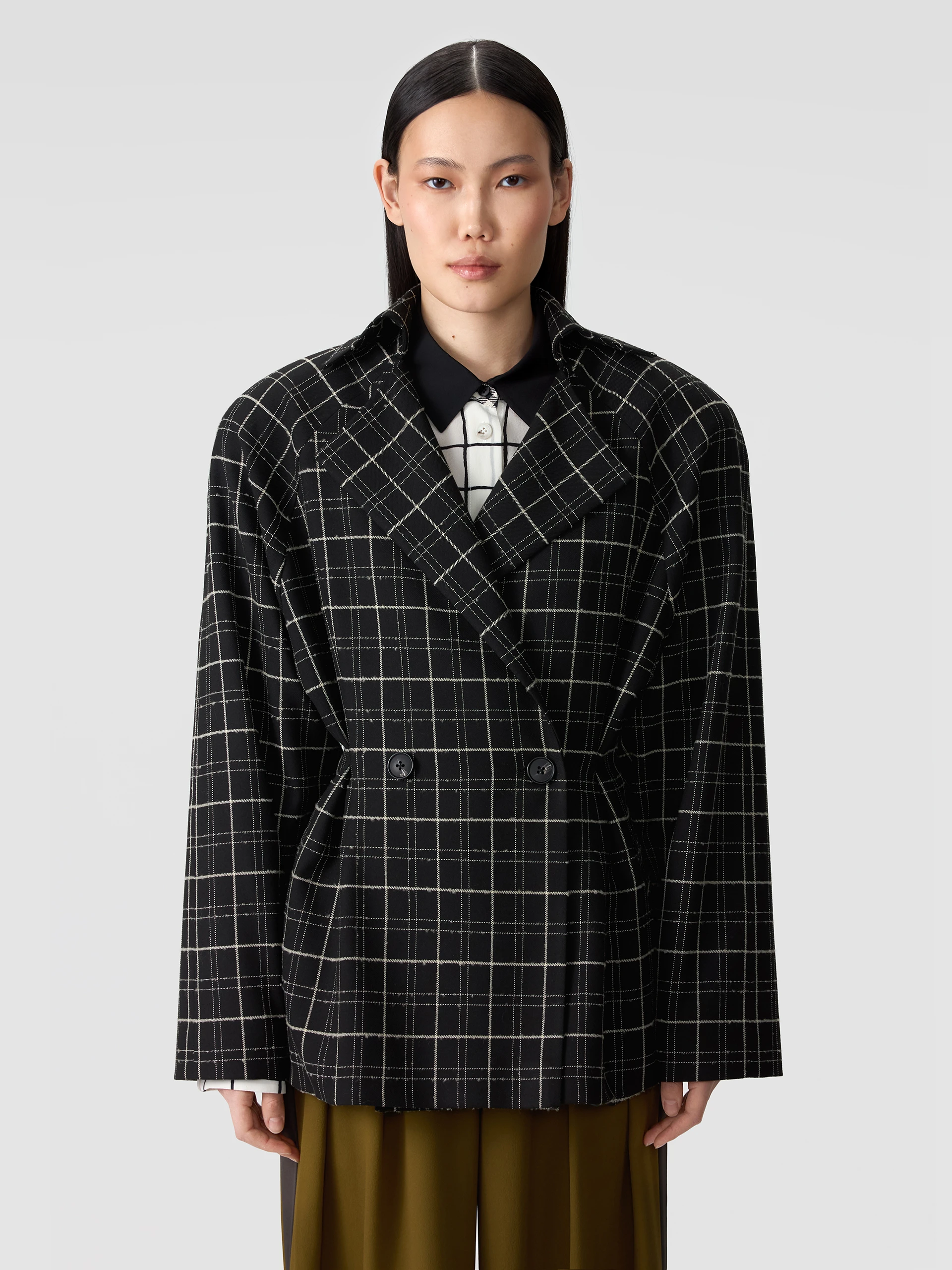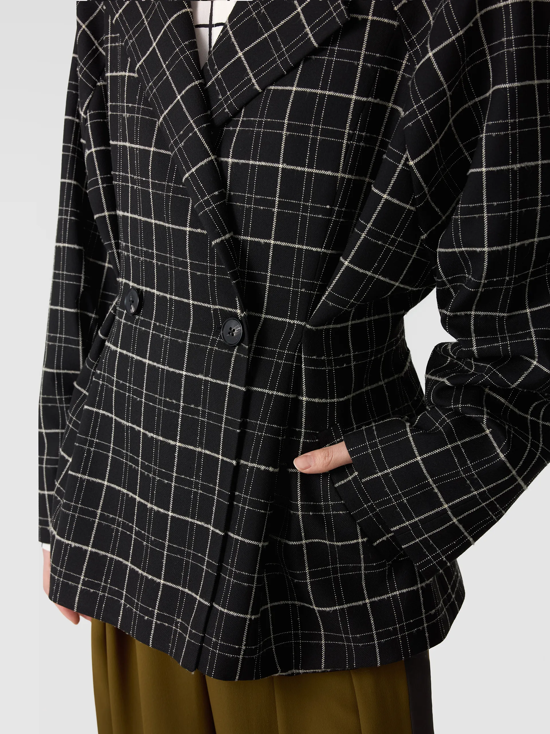 Унисекс жакет оверсайз из микса струящихся тканей. Однотонный жакет жемчужного цвета с деконструированным кроем. Закрытая отделка внешних швов. Имитация подкладки на спинке и рукавах тканью в полоску. Английский воротник. Два накладных кармана. Двубортная застежка на пуговицы унисекс. Декоративные пуговицы на внутренней стороне рукавов. Шлица сзади.