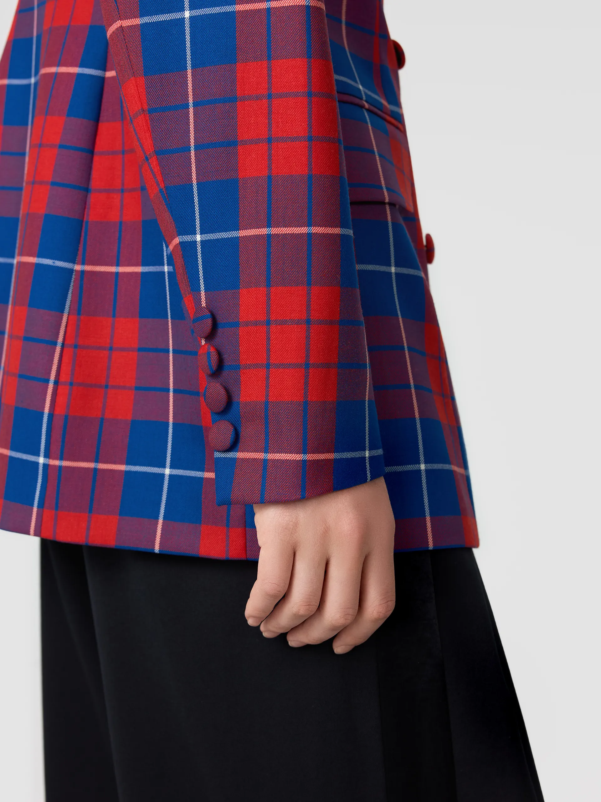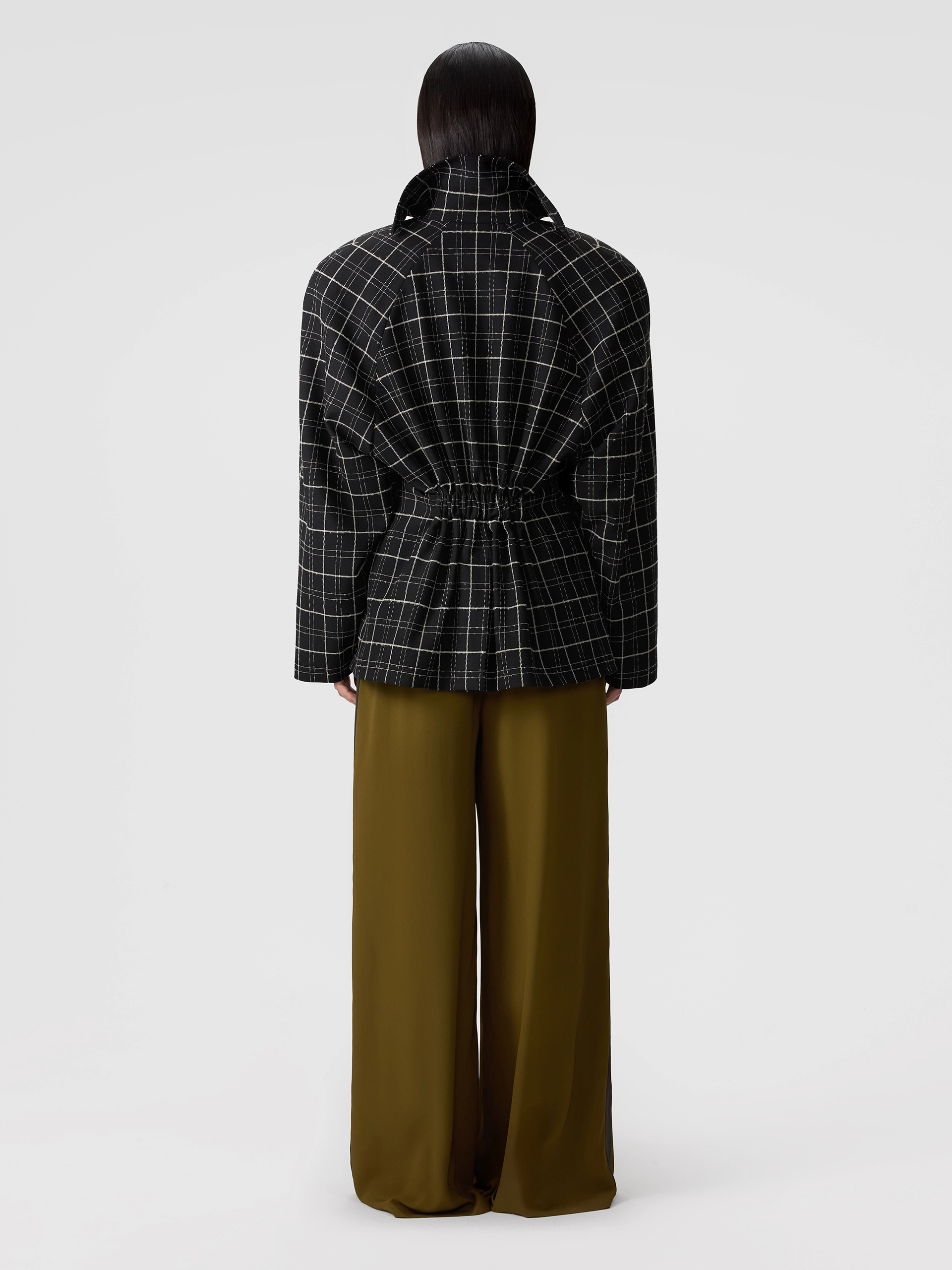 Внутренняя сторона жакета из однотонной ткани жемчужного оттенка с атласным эффектом.